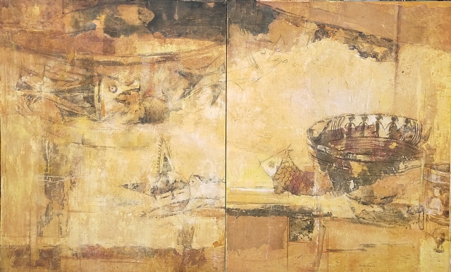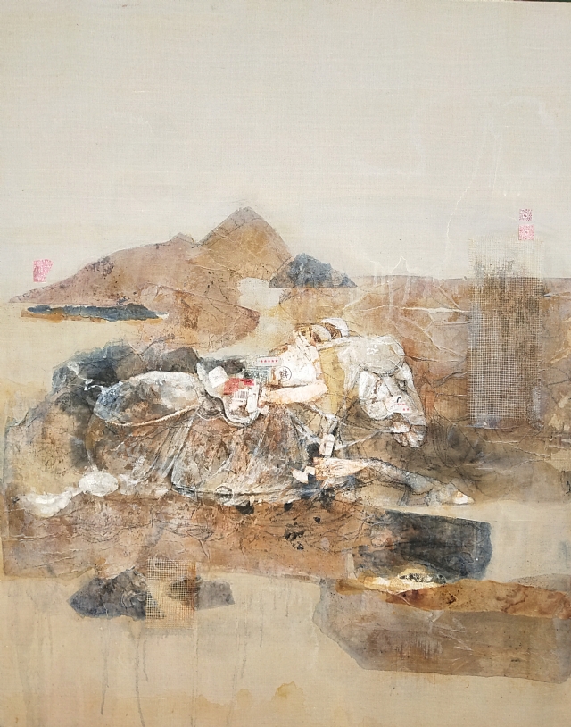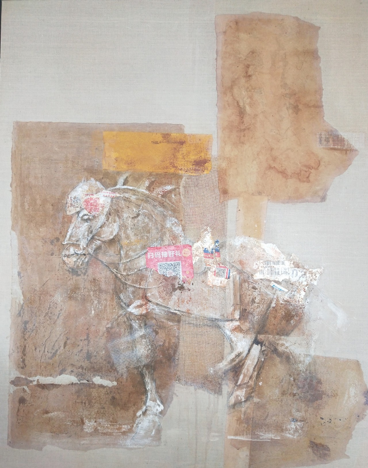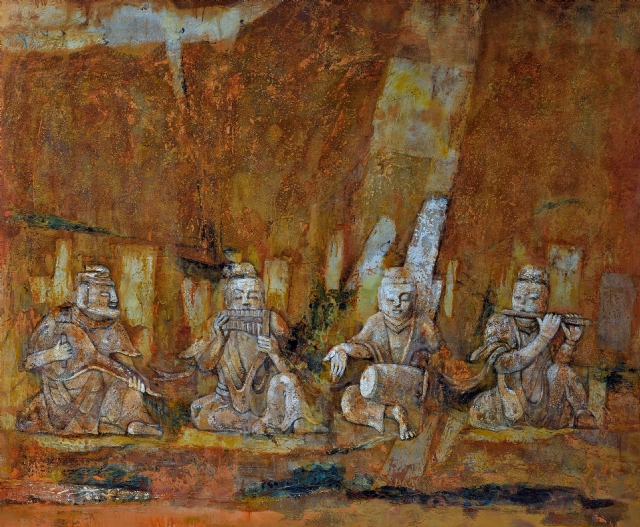 占蘭生活于古都洛陽(yáng),風(fēng)物養(yǎng)人性,秉賦有傳承。洛陽(yáng)獨(dú)特、濃郁的人文滋養(yǎng),再加上正規(guī)科班基底和慧心蘭質(zhì),使得她在從油畫到綜繪的表現(xiàn)也是如此的自然而水到渠成。如果說,鐘情于表現(xiàn)主義的占蘭,油畫中巧妙將石窟、造像、河洛風(fēng)土風(fēng)物,這些粗獷而質(zhì)重的元素入畫,與她細(xì)膩的思想筆觸相融合,進(jìn)而形成了她厚重不失溫婉、率真常著深味的獨(dú)特的畫風(fēng)。那么,占蘭的綜繪,保留這創(chuàng)作風(fēng)格的藝術(shù)基質(zhì),取材依舊以古、佛、雕塑、文物居多,只是視野和思緒理見寬廣,不論東西古今,以黃暖主打色覺,端莊雅正而沒有粉飾之感,厚重蘊(yùn)含著大氣。所有作品意象與整個(gè)畫面均給人以典雅、厚重、沉實(shí)之感。