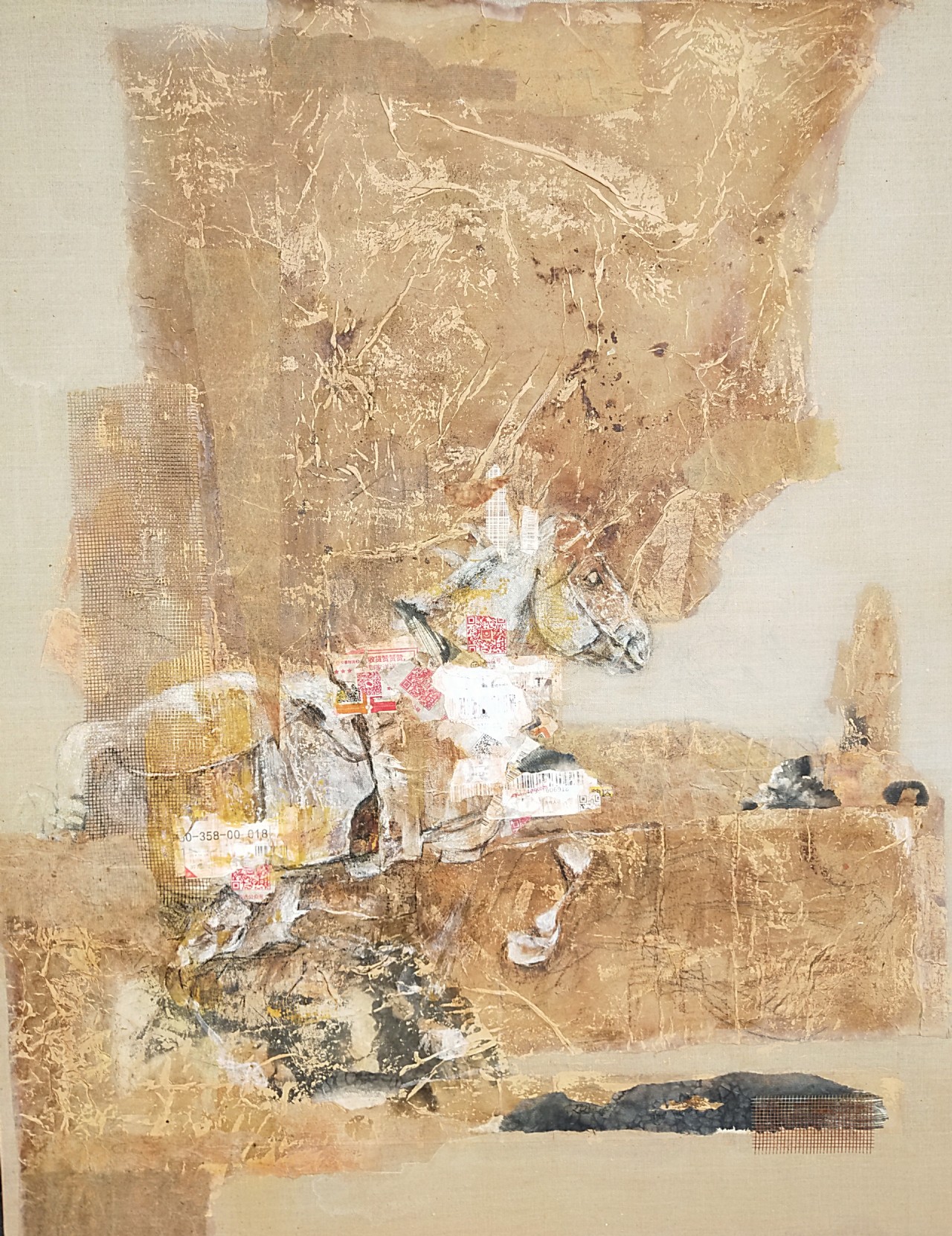 占蘭也在不斷地調(diào)整和突破,嘗試著把材料融入繪畫表現(xiàn),體驗(yàn)材料間的美感生成和互融,進(jìn)一步豐富和拓展。綜合材料繪畫是時(shí)代發(fā)展的產(chǎn)物。從某種意義上講,綜合材料繪畫,無論是材料、色處理還是手法等都是對(duì)傳統(tǒng)藝術(shù)的一次的大的揚(yáng)棄和革新。綜繪肇興以來,嘗試者眾,成蛹者少。占蘭卻以其特有的藝術(shù)敏感和秉賦,也許還滲以習(xí)思積淀的厚實(shí),呈現(xiàn)出一種與傳統(tǒng)及個(gè)人風(fēng)格相沿襲的內(nèi)在脈絡(luò),于清凈純樸之中還夾雜著絲絲的古韻、素淡。