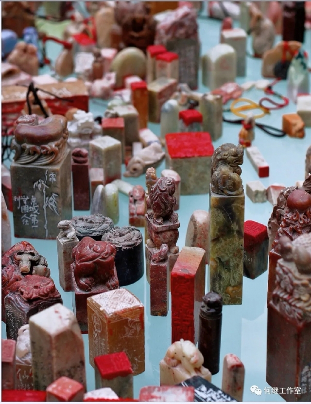 印章一直是個(gè)人的身份標(biāo)識(shí)和文化符號(hào),特別是明朝,文人把印章更加私有化,并從藝術(shù)與身世層面來(lái)探討它的存在!此后,篆刻家身份出現(xiàn)了,由于學(xué)識(shí)修養(yǎng)的退化,到今天的篆刻者,只能稱職業(yè)篆刻藝人,它仿佛與貴族擺脫了關(guān)系。我十四歲開始學(xué)篆刻,二十年我刻過(guò)章石大約萬(wàn)余方,在歷代印的壇各個(gè)流派,我曾刻苦模仿,特別是漢印,清代碑學(xué)家鄧石如的美學(xué)思想、以及當(dāng)代的齊白石等諸家印學(xué)文脈對(duì)我啟發(fā)甚大,如今,所剩之印,多為殘印枯石,印風(fēng)禿嚕,反觀近年作品,因大多與今天這個(gè)時(shí)代的鏡像有關(guān),我且稱作為自己的私章為后工業(yè)風(fēng)格!