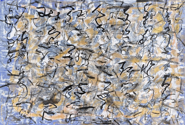 2011年,恰巧國(guó)際書象學(xué)社正在招收第一屆學(xué)員,開蘭懵懵懂懂撞進(jìn)了這個(gè)中國(guó)的“抽象藝術(shù)搖籃”,成為魏立剛先生的入室弟子,那年她四十五歲。俗話說(shuō)四十不學(xué)藝,可開蘭就偏偏不信這個(gè)理兒,愣是憑著一股牛勁闖入這令人生畏的抽象藝術(shù)圈。我說(shuō)“開蘭現(xiàn)象”屬于當(dāng)今藝術(shù)界的一個(gè)“特例”,因?yàn)樗?jīng)歷了藝術(shù)家成長(zhǎng)的非常之道。