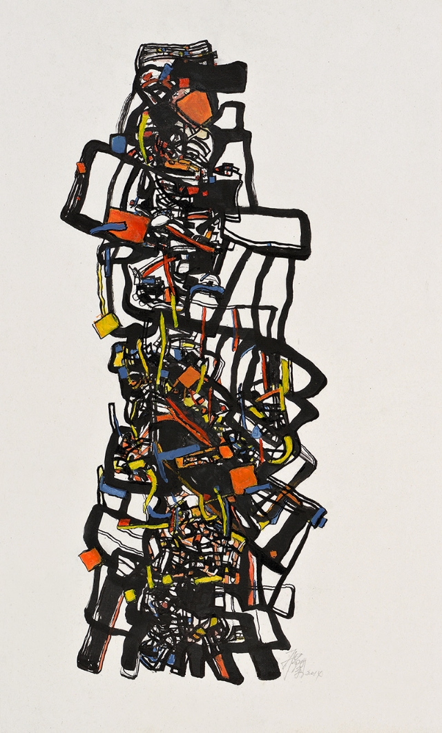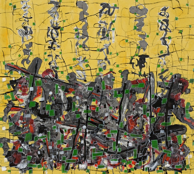 其次,開蘭之所以能如此迅速進(jìn)入“魏氏模塊”教學(xué)實(shí)踐,還得益于她工程師的“數(shù)理”背景優(yōu)勢(shì),那異常發(fā)達(dá)數(shù)理思維邏輯,一經(jīng)恩師的“點(diǎn)撥”便即刻被“迸發(fā)”出來(lái),成為勢(shì)不可擋的創(chuàng)造能量注入開蘭的一幅幅作品中。從她的畫面中,我們很容易感受到形與形、線與線、點(diǎn)與點(diǎn)之間的“對(duì)話”,以及線性生命的沖突與生態(tài)的平衡;感受到形與色“抽象”的精氣與活力。這使得她的作品與當(dāng)代乃至世界的畫家拉開了很大的距離,顯示出自身強(qiáng)烈的個(gè)性風(fēng)格。