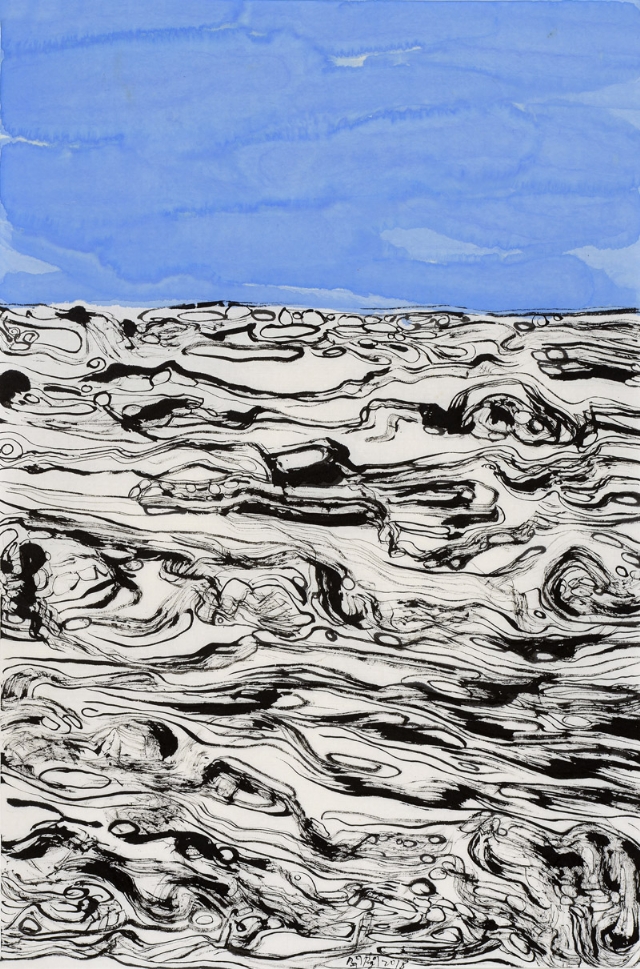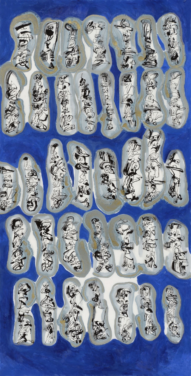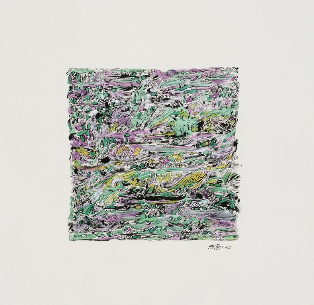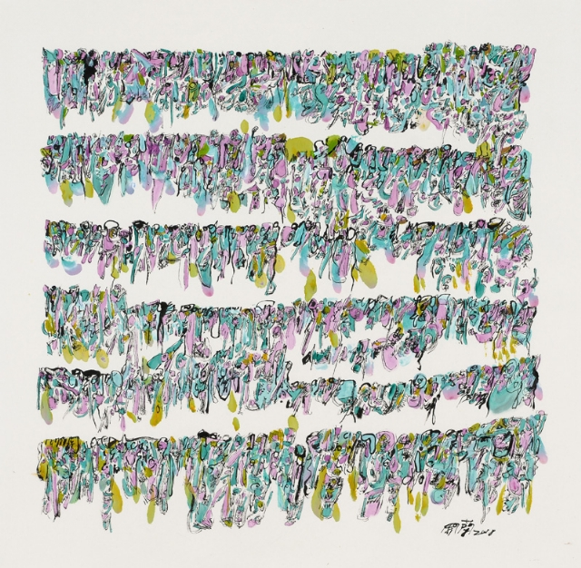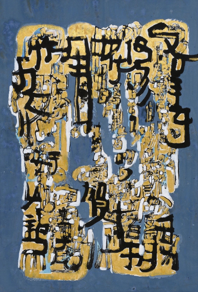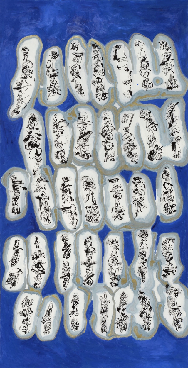 馮開蘭是大連的書象學(xué)派黃埔戰(zhàn)士,曾經(jīng)的機(jī)械工程師,她癡迷地給童話里的每個(gè)角色能縫制出絢麗的服飾來,她曾經(jīng)隱藏在荒村中求師琢磨油畫,而她的女兒遠(yuǎn)走德國(guó),在海風(fēng)拂郁的布萊梅古城里攻讀藝術(shù),她變賣了房子投奔魏館,成了黃埔一期的書象派藝術(shù)家。挑燈夜戰(zhàn),苦臨古碑;撕豪沏墨,織構(gòu)心圖。蠶豆大的怪字亂石鋪街,我定義其為神奇的小楷,色符線咒揖錯(cuò),野壑荒椏蝶喧,將你羽化,拋墮云端?!榜T氏魔塊”如外星床械,呼嘯盤空,金屬般樂音裂錦煙壤?!耙粋€(gè)魅影移動(dòng),火把跳蟻,我的窗戶敞著,眼前是黑蛾堆疊的山巒,月光瀉在潭水銀色鏡面上……”開蘭的札記引我入境,而她的辯駁不亢與詩詞偶賦的韻致共聞。這樣一個(gè)藝術(shù)家,她靈魂的格架已顯,匹配不屈的斗志,以及似是天賦的制造手腕,她能成器,弄不好還是個(gè)大器,一座旖旎的峰巒,春云卷,秋雨澆。