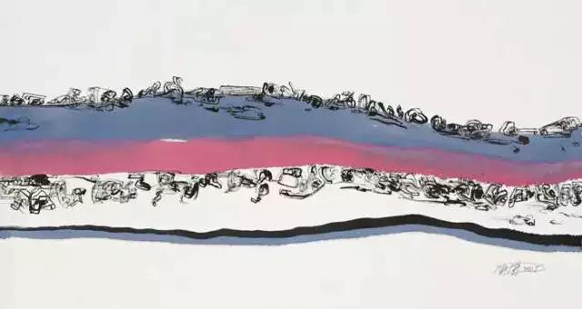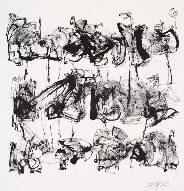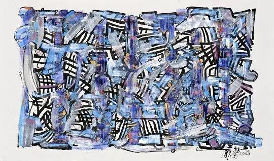 我問她:你畫抽象畫卻受限于漢字,是否會阻礙你的想象力?她給我的答案是否定的。中國的漢字是象形文字,也是古代象形字中唯一保存至今仍在使用的文字。世界上大部分的文字都從圖形文字轉(zhuǎn)換成了字母文字。書法里含著萬象。筆劃的不同組合成了不同的文字,而不同文字的組合更是無窮無盡。她有了漢字,靈感的源泉便不會枯竭,而漢字這承載著數(shù)千年華夏文明的載體也有無窮盡的故事要述說。