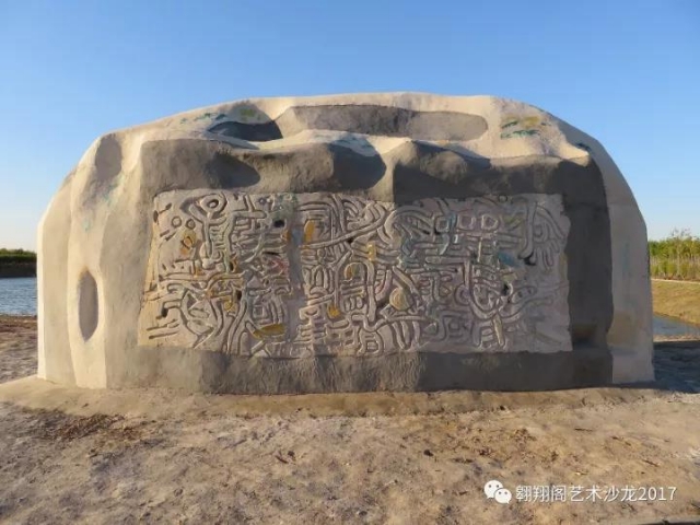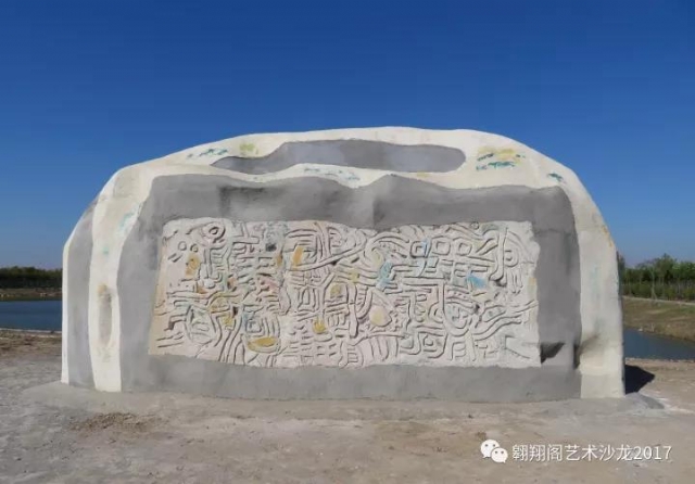 作 品 簡 介:《碣石新篇》的外型是一塊巨石,雙面刻繪抽象漢字繪畫 , 作品內部是洞腔,仿巖洞,洞壁繪有巖畫,可供觀眾 穿行、探索、休息、欣賞。石頂安裝有攝像頭,實時將對面湖光 景色,通過設在洞內的投影儀投射在洞內的巖畫上。
