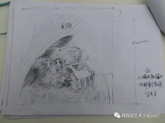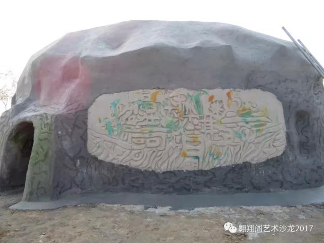 但沒有現(xiàn)成的石頭,去采集肯定很費時又要花費巨資。所以在與工程人員溝通之后,決定用水泥塑造一塊仿真石頭??紤]到鑫嘉源園區(qū)是以旅游觀光為主的生態(tài)園區(qū),作品應該能具有更好的互動游玩的功能,因而決定構建一個內腔,如山洞般可供游人穿越、探索。洞壁上繪制反映古人類生活的巖畫。讓更多的當地百姓能從更多的角度去欣賞這樣一個作品。構思形成后,就繪制了草圖交與組委會審核通過。