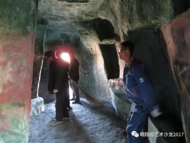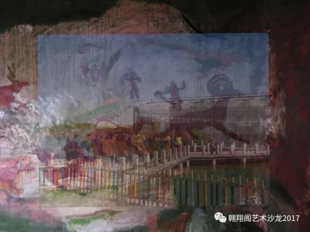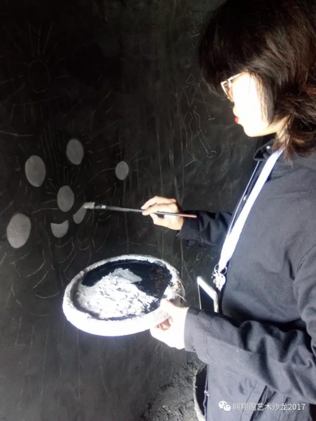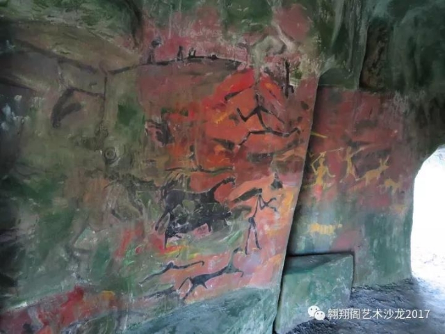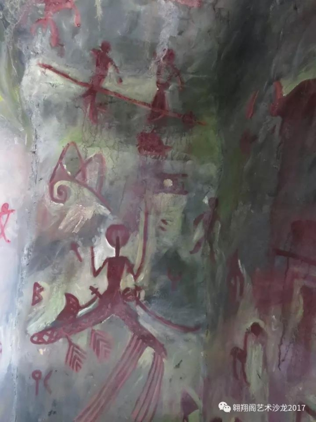 27日,用一天的時間,與來園區(qū)辦事的客串藝術家小黑合作,把洞內巖畫整體鋪了一遍。效果也很出乎意料。因為這么多年我一直畫抽象,實在不知道這把握巨像畫面的能力也在與日俱增。