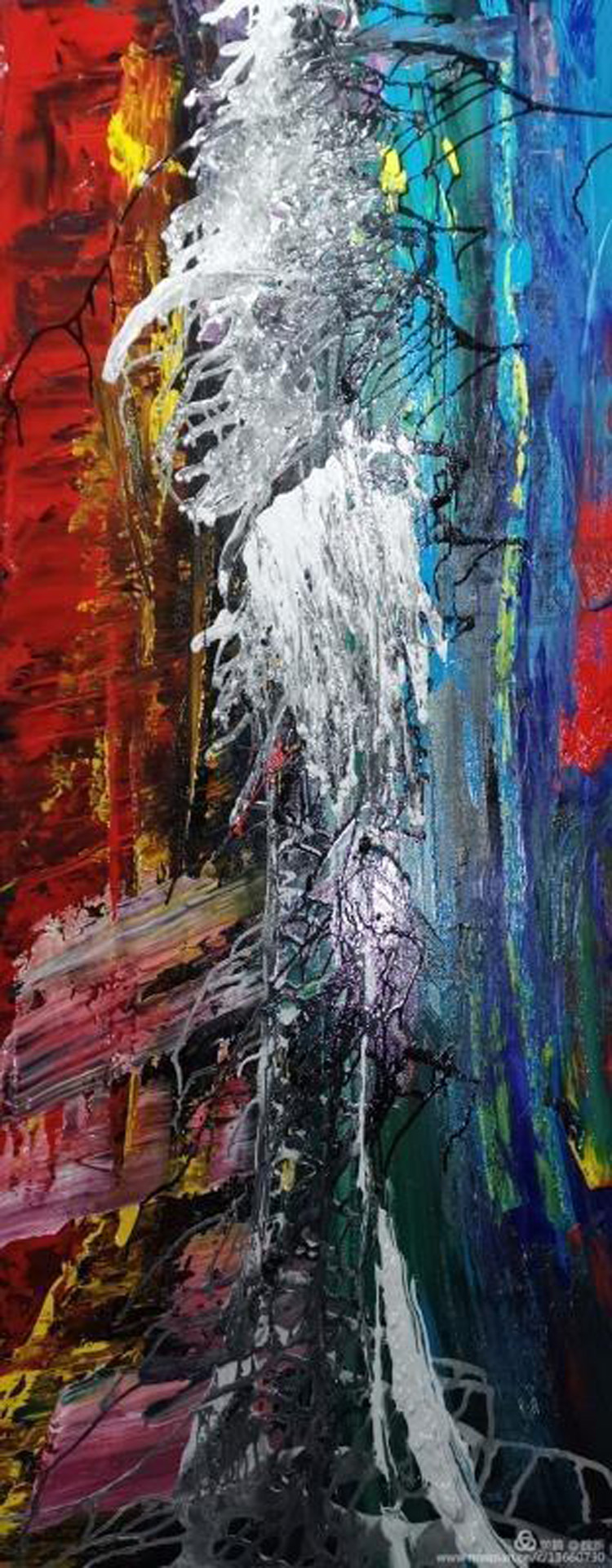 長(zhǎng)期以來(lái)在所有的繪畫(huà)領(lǐng)域里,藝術(shù)家總是試圖努力提高繪畫(huà)語(yǔ)言的表現(xiàn), 這正是魏新所做的卓越探索。在他近幾年秘密探索景德鎮(zhèn)千年釉色的作品中感受到色彩和形式之間的張力,是一種對(duì)視覺(jué)破壞的終極“宣戰(zhàn)”, 是對(duì)傳統(tǒng)油畫(huà)媒介-亞麻布的恐怖襲擊。(見(jiàn)圖火噴槍?zhuān)乃a(chǎn)生的遺跡中人類(lèi)可體悟到所謂羅曼蒂克的繪畫(huà)媒介被慘無(wú)人地道被蹂躪之后產(chǎn)生的壯觀(guān)景象和又如電荷搬的細(xì)微差別,以及直接的能量總是讓人心懷激蕩。雖然顏料是一個(gè)主要的媒介在藝術(shù)家的作品中,(甚至在那里以壓倒圖像平面的點(diǎn)、線(xiàn)、面并由此開(kāi)始主宰形狀和形式)藝術(shù)家是色調(diào)和色調(diào)的應(yīng)用特別敏感者??傮w而言,當(dāng)我們看到藝術(shù)家的作品光譜顏色滲透視覺(jué)時(shí)使它所散發(fā)的活力和存在是對(duì)觀(guān)者心靈愉悅的無(wú)限滿(mǎn)足,我把魏新的最新騷動(dòng)繪畫(huà)歸類(lèi)為蝕變遺傳學(xué)繪畫(huà)范疇里去,因?yàn)槲蚁嘈潘鼤?huì)在世界繪畫(huà)語(yǔ)言學(xué)領(lǐng)域中像癌變樣地?cái)U(kuò)散。