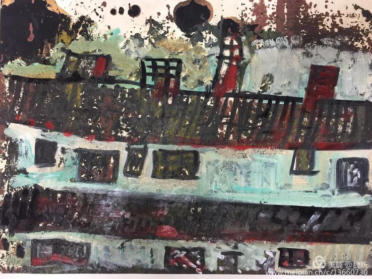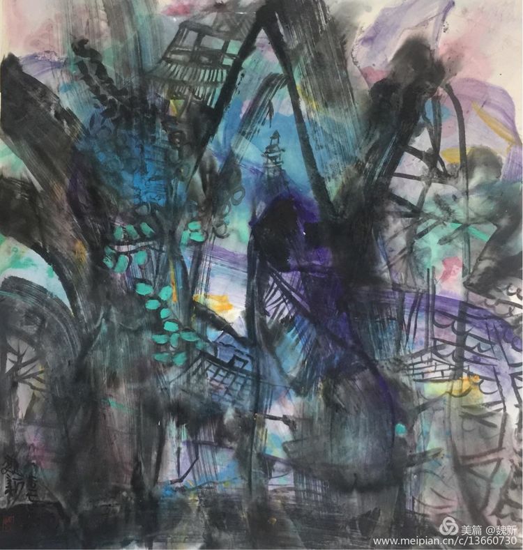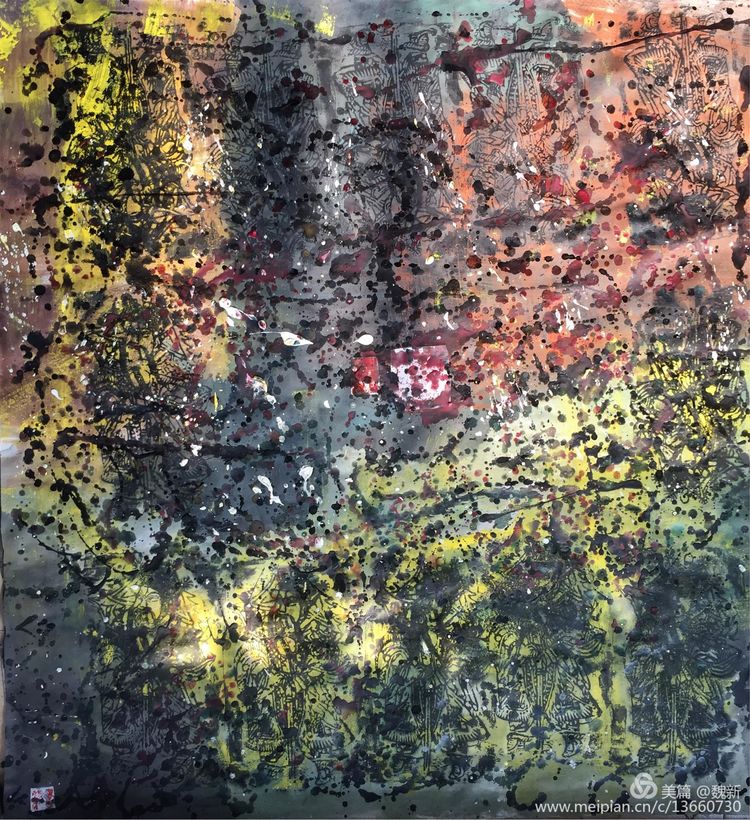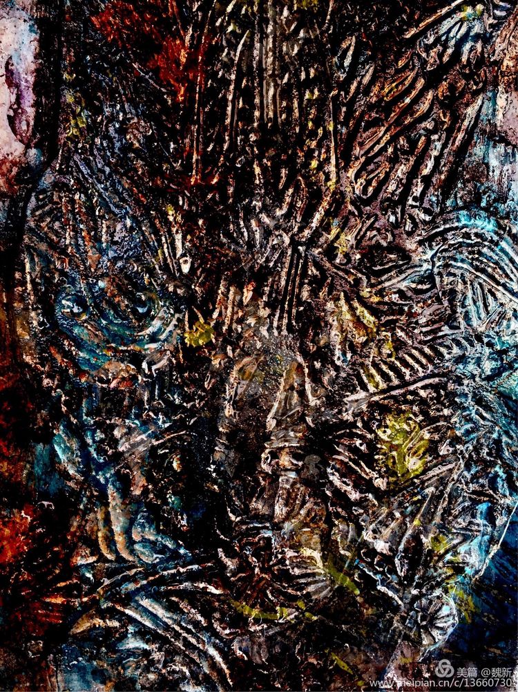 《跡象~楚夢(mèng)》重彩作者魏新。佳作!集"壯、奇、美"于一身,是楚文化最鼎盛時(shí)期的象征。用豐富的色彩、線條語言裝飾支持"楚夢(mèng)"的六大支柱:青銅冶鑄、髹漆工藝、絲織刺繡、美術(shù)音樂、老莊哲學(xué)、屈騷文學(xué)。詮釋其楚漢文化的神巫性、浪漫性,及卓然不屈精神的文化特征。