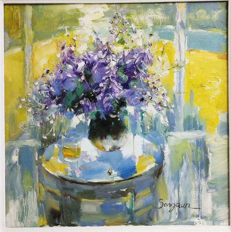 我曾經(jīng)畫過好多幅丁香花,有的在窗前,有的在角落,有的在灑滿陽光的院子里,有的在夜深人靜的燈下??僧嫴忌系亩∠慊ㄓ衷跄鼙鹊蒙涎矍斑@般生動(dòng),這般鮮活,這般明媚,這般生機(jī)無限的丁香花呢?