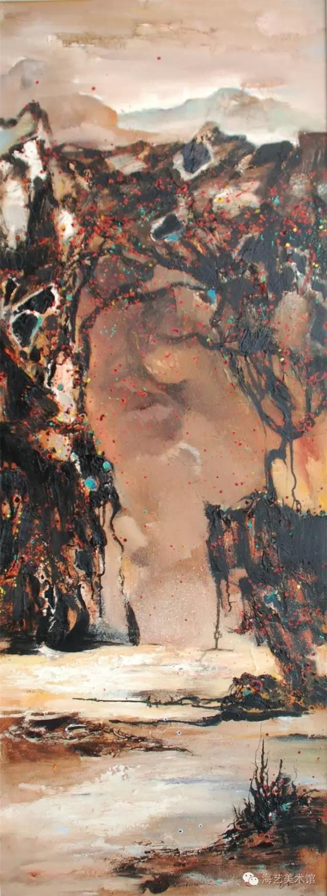 《意之境》系列輪回、南流、磐桓、山語(yǔ)、閉冬、逶迤、逍遙、花心、再生等,作品畫(huà)面上或奔騰或激烈或狂放不羈的筆調(diào),那些色塊,那些急如驟雨的,那些用漆、金箔、云母、中國(guó)礦物質(zhì)顏料、黃土、沙石等等材料發(fā)散在畫(huà)面的點(diǎn),有時(shí)候如風(fēng)起云涌,有時(shí)候驚濤駭浪,但似乎都在尋找一種畫(huà)面上的平衡、互動(dòng)、牽制,尋找一種在生命可以超越的豁達(dá)與平靜。