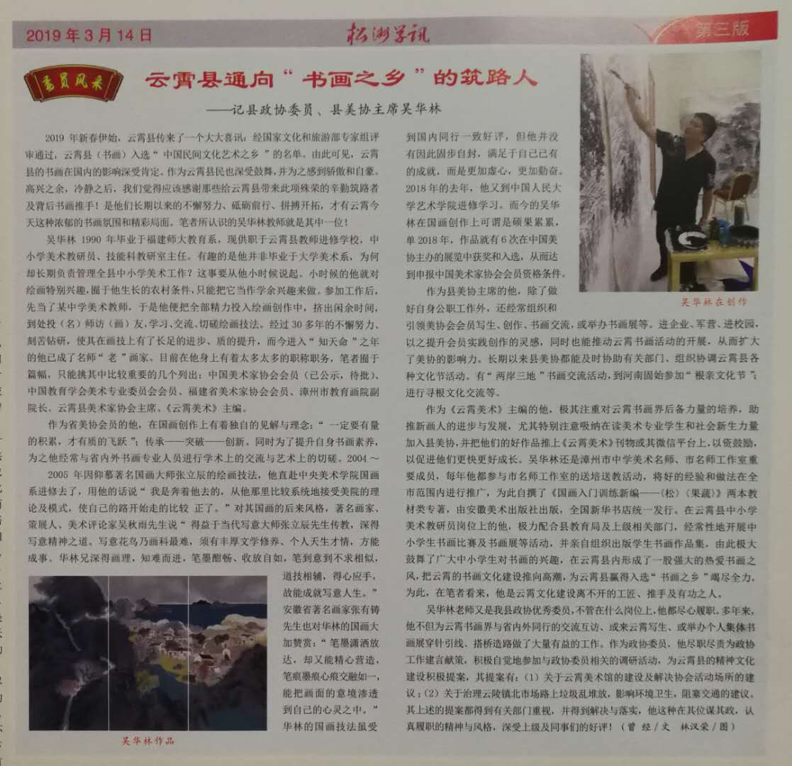 2019年新春伊始,云霄縣傳來了一個特大喜訊:經(jīng)國家文化和旅游部專家組評審?fù)ㄟ^,云霄縣(書畫)入選“中國民間文化藝術(shù)之鄉(xiāng)”的名單。由此可見,云霄縣的書畫在國內(nèi)的影響深受肯定。作為云霄人民也深受鼓舞,并為之感到驕傲和自豪。高興之余,冷靜之后,我們覺得應(yīng)該感謝那些給云霄縣帶來此項(xiàng)殊榮的辛勤筑路者及背后書畫推手!是他們長期以來的不懈努力、砥礪前行、拼搏開拓,才有云霄今天這種濃郁的書畫氛圍和精彩局面。筆者所認(rèn)識的吳華林老師就是其中一位!