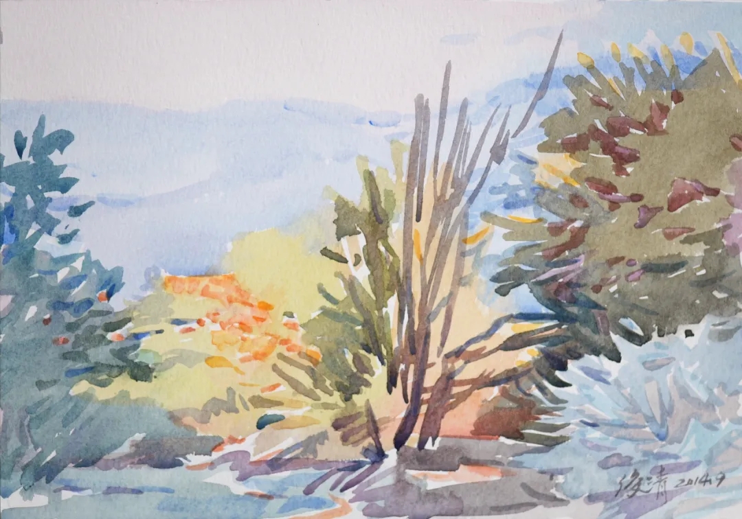 五月仲夏,萬物生長,廈門正值繁花盛放之時。晉代謝混有詩《游西池》云:“惠風(fēng)蕩繁囿,白云屯曾阿。景昃鳴禽集,水木湛清華。”詩人描述惠風(fēng)和暢、云天斜陽下的景色,令人想起黃俊清的水彩畫。一方天地,清麗俊雅,枝頭微風(fēng)吹拂著,園裡花草輕搖著;云捲云舒,水湛清光,蘊(yùn)涵恬淡迷人的風(fēng)華意趣。