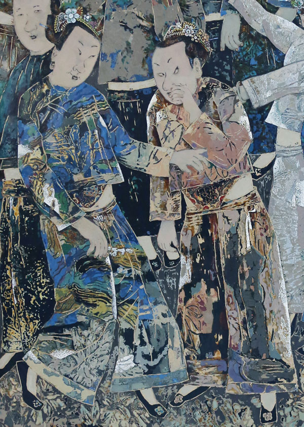 作品構(gòu)圖上呈團(tuán)狀,強(qiáng)調(diào)畫面的形式感和凝聚力;色彩上吸收民間年畫、中國陶瓷的元素;造型上結(jié)合中國畫線的表現(xiàn)語言和民間剪紙的平面感。整張畫面?zhèn)鬟_(dá)出強(qiáng)烈的中國文化特點(diǎn),這也是我們對漆畫藝術(shù)創(chuàng)作的一次大膽探索。
