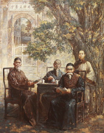 與《陳寶琛》有緣,理由有三。其一,陳寶琛為我校---福建師范大學(xué)的創(chuàng)辦者,福建閩縣(今福州)人。其在家鄉(xiāng)二十余年間,積極辦教育,辦鐵路,創(chuàng)辦各種公、私立的新式學(xué)校30余所,為福建近代教育發(fā)展作出不朽的貢獻(xiàn)。其二,與陳寶琛后人為友。2010年,因博士論文的撰寫前往臺灣收集素材時,在文化大學(xué)巧遇陳寶琛后人-----文化大學(xué)博物館館長陳明湘女士。經(jīng)幾次來往成為朋友,期間我陪陳館長專程探望福州城郊的陳氏故居和族親。其三,因福建省藝術(shù)創(chuàng)作與之結(jié)緣。首先,2009年福建省文聯(lián)為舉辦“錦繡海西——福建省當(dāng)代美術(shù)晉京展”而發(fā)動省內(nèi)藝術(shù)家進(jìn)行主題創(chuàng)作,表現(xiàn)八閩名人軼事、人文景觀與自然景觀等。我有幸合作創(chuàng)作大型歷史畫《閩水萬古流》(280X860cm)。該作品表現(xiàn)福建上下兩千多年具有代表性的50位杰出歷史人物以及著名的人文自然景觀。作品在中國美術(shù)館展出時廣受好評。陳寶琛是作品中人物之一。其次,自2005年國家重大歷史題材美術(shù)創(chuàng)作工程啟動之后,各省紛紛開展重大歷史題材創(chuàng)作。2010年,福建省文化廳也啟動“福建省近代以來重大歷史題材美術(shù)創(chuàng)作工程”, 陳寶琛成為我創(chuàng)作主題。之后,它與《閩水萬古流》同時入選該工程。兩年前,《陳寶琛》就是在該作品的基礎(chǔ)上不斷修善而入選首屆國家藝術(shù)基金美術(shù)、書法、攝影創(chuàng)作人才資助項(xiàng)目,并獲得2016年國家藝術(shù)基金滾動資助項(xiàng)目。