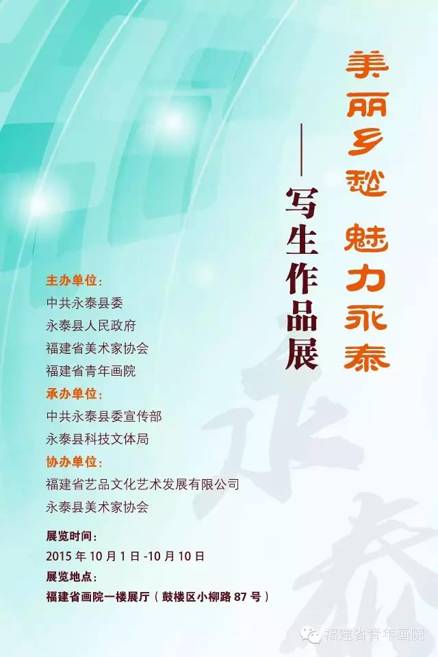 由中共永泰縣委、永泰縣人民政府、福建省美術(shù)家協(xié)會(huì)、福建省青年畫院主辦,中共永泰縣委宣傳部、永泰縣科技文體局承辦,福建省藝品文化藝術(shù)發(fā)展有限公司、永泰縣美術(shù)家協(xié)會(huì)協(xié)辦的“美麗鄉(xiāng)愁 魅力永泰--寫生作品展”將于10月1日在福建省畫院開展。共計(jì)將展出作品80余幅,歡迎蒞臨鑒賞!