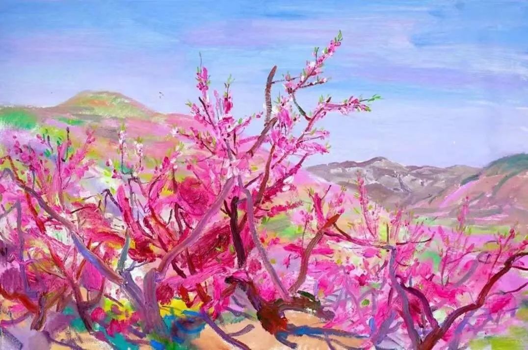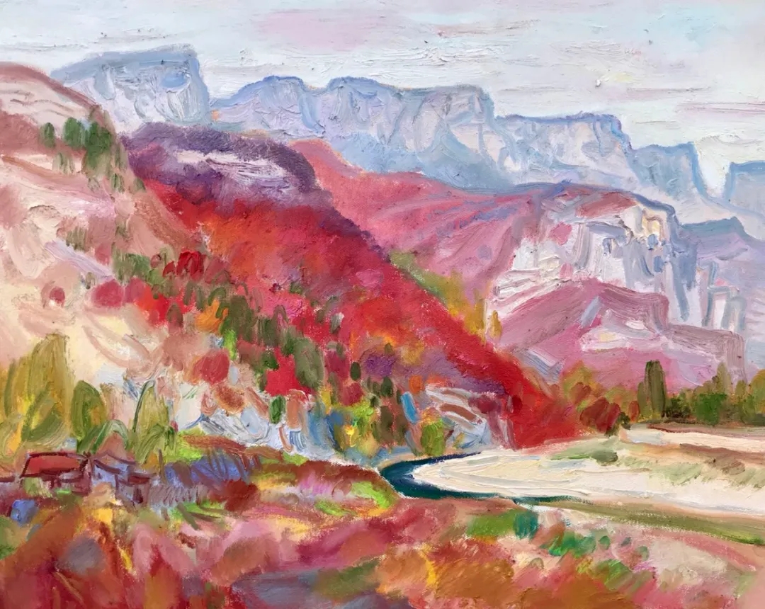 宋衛(wèi)東的個人藝術(shù)之路,在前人的啟迪中展開。他多在畫面中表現(xiàn)風(fēng)景、山水,對他而言,風(fēng)景畫不只是一種體裁或題材,而是一種精神歸宿,是實現(xiàn)自我的一個通道。在面對山水自然和建筑樹石的臨場寫生中,他以“寫”的方式提煉色彩和形象,把感受到的意象轉(zhuǎn)化為對事物本質(zhì)的塑造,在單純的寫生基礎(chǔ)上增添文化自覺意識的內(nèi)涵,使畫面帶有中國繪畫思維的烙印。