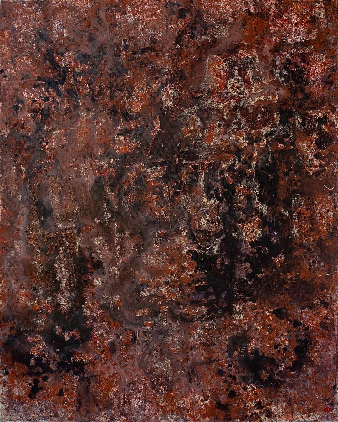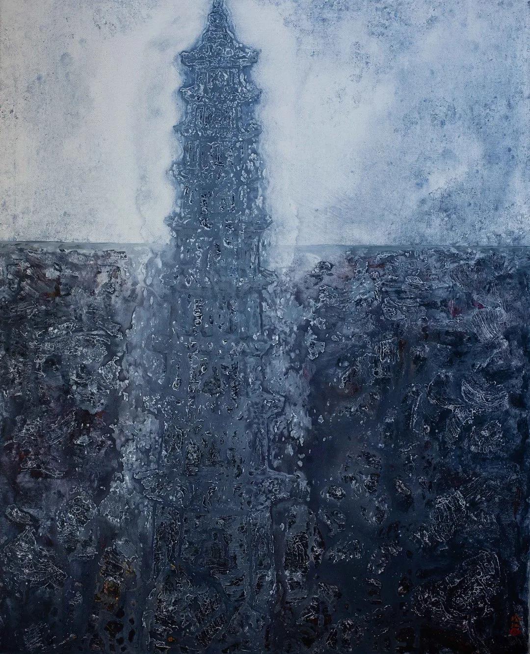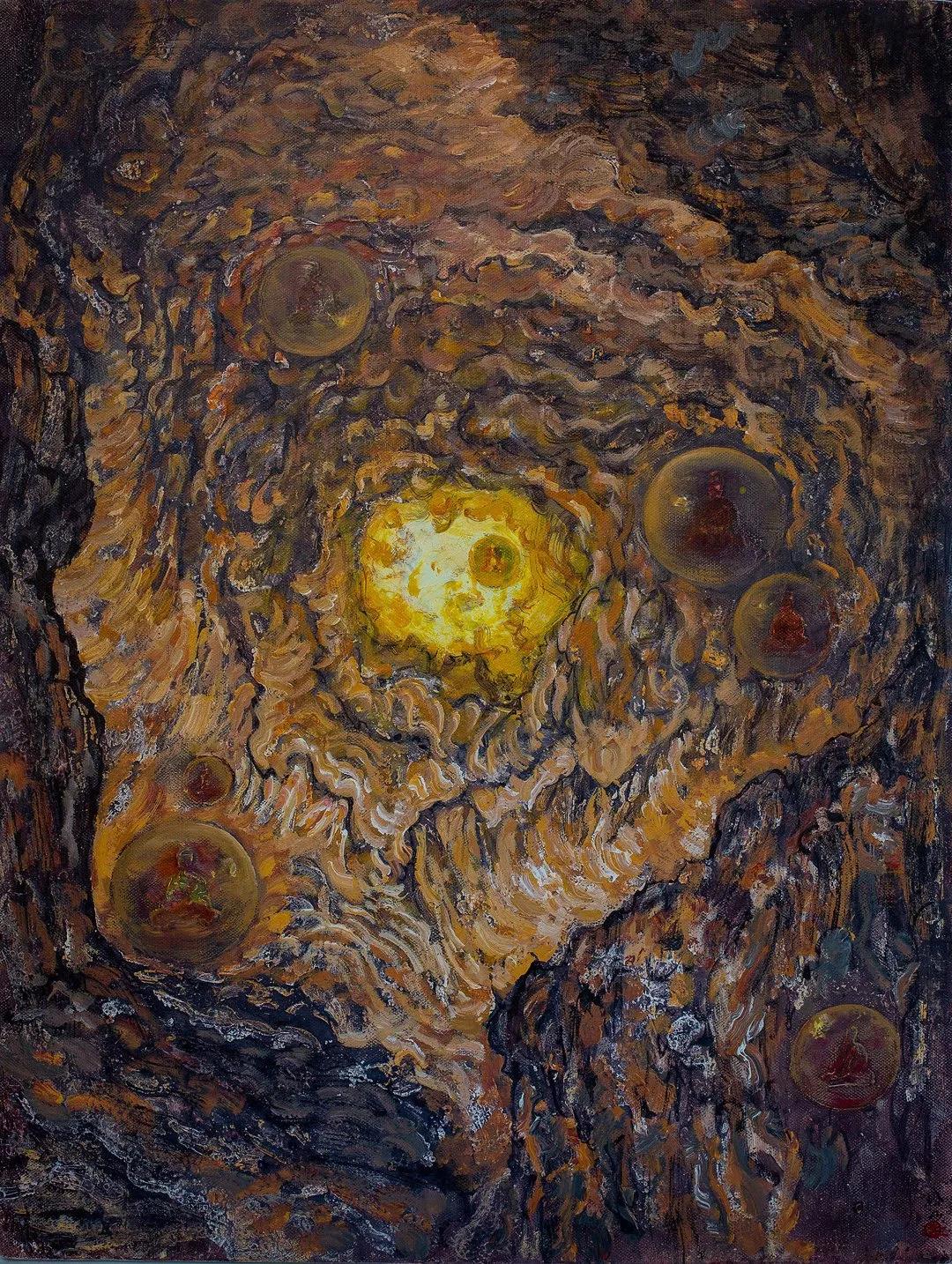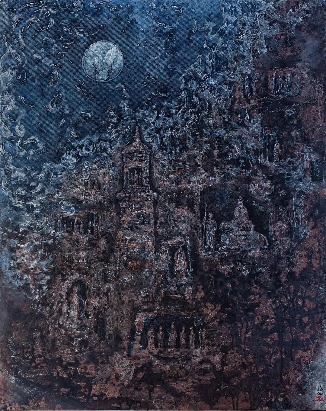 過去和現(xiàn)在,我可以想象李江先生在樂山的“沃土”中一面于現(xiàn)實的生活中掙扎,一面在精神的世界里“涂抹”,樂山獨(dú)特的地域文化和“禪意”理念也必然影響他的個人情感。他以油畫為媒介,從“飛石系列”到“禪意系列”,個性的色彩和極具禪意的“佛像”“蓮花”等元素符號在畫面中反復(fù)疊置,讓人聯(lián)想到自然萬物幻滅幻生的規(guī)律。“那些巨大的隕石燃燒著從太空砸向大地,那種張力,那種速度,那種不明來歷的物質(zhì)從天而降,從我們的頭頂飛過,災(zāi)難似乎就在轉(zhuǎn)瞬之間?!庇信笥堰@樣闡釋李江的作品。在我看來,看畫就是在讀“自己”的內(nèi)心,原來“自己”的心并沒有被年復(fù)一年,日復(fù)一日,一成不變,令人窒息的生活所扼殺。突然覺得,李江先生和我原來都沒有片刻忘記人性里對善意和美好的追求......