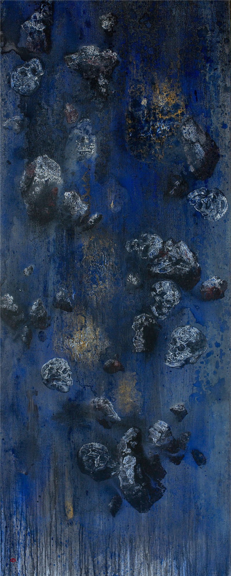 記者:看您的畫面,其中的石頭就像是隕石一樣來自天外,或者是大爆炸一樣四處飛濺,為什么會這樣處理畫面?雖然是油畫作品,但還是可以看到很多傳統(tǒng)的意味,能否談?wù)勥@方面您的實踐?