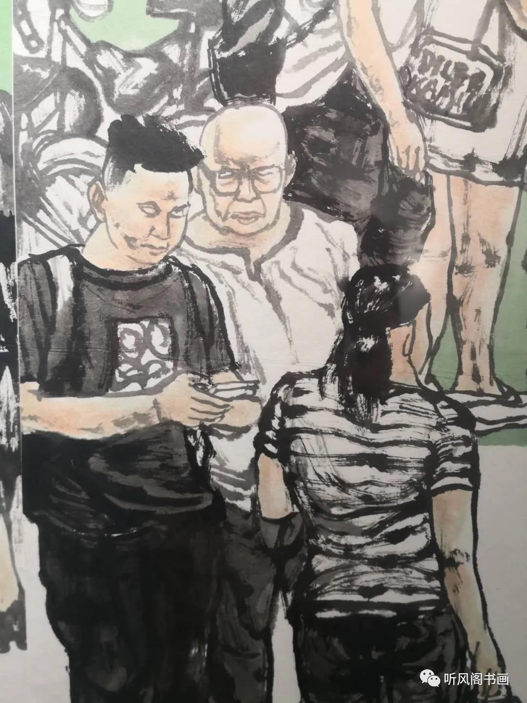 蟹老板畫畫幾乎不打草稿,他畫人物,不管是尺寸多大,六尺或者八尺,一個人或者是一群人,他從一個人的頭開始,畫到最后一個人的腳結(jié)束,從來都是洋洋灑灑一勾到底,沒有強悍的造型基礎(chǔ)和整體的把控能力是無法這樣作畫的。在人物畫壇,能這樣子作畫的,我想為數(shù)也不多。