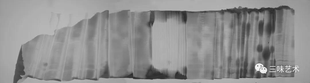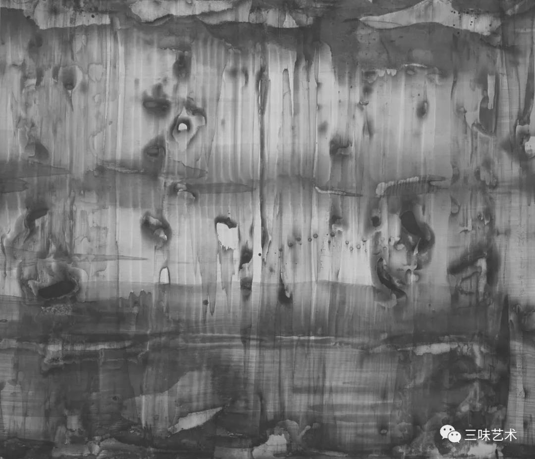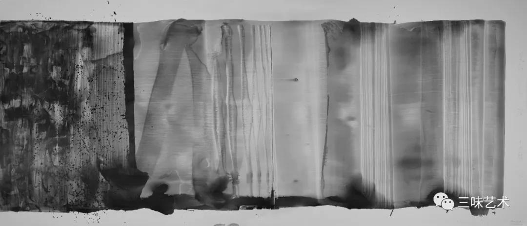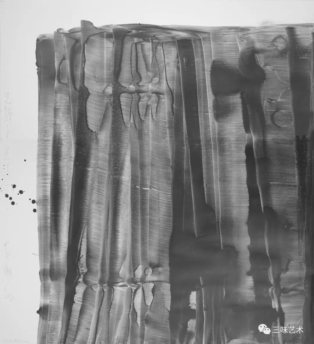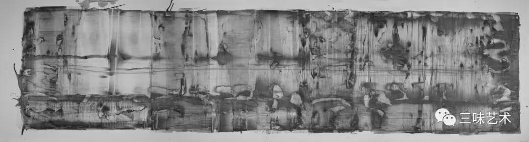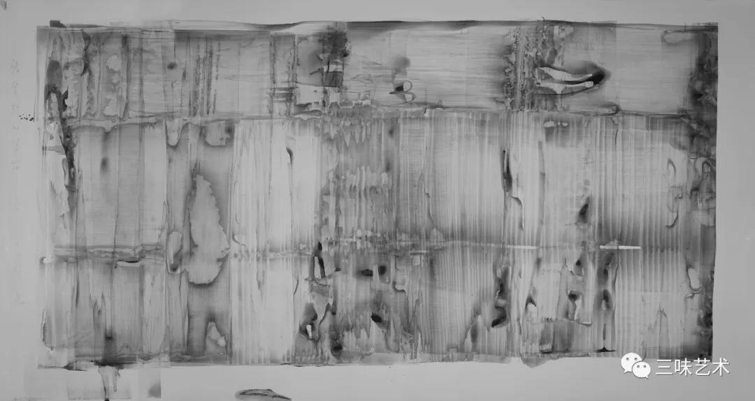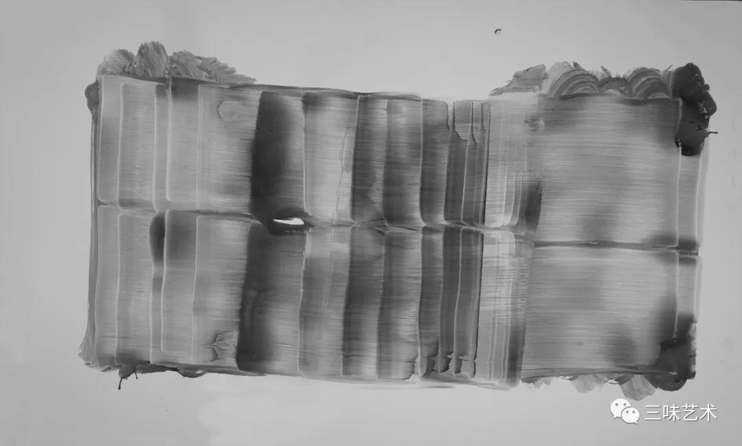 有意思的是,2011年以后,吳國全再次回到了自己創(chuàng)作的原初起點(diǎn)與邏輯關(guān)系之中。資料顯示,他此后既創(chuàng)作了《圖片水墨》系列,也創(chuàng)作了《硬質(zhì)水墨》系列;既創(chuàng)作了《砸墨》系列,也創(chuàng)作了《狂草水墨》系列。與他過去的水墨創(chuàng)作相比,很明顯的是,這些不同系列的作品已經(jīng)偏離了他先前的表現(xiàn)主義創(chuàng)作路線,并且是在往抽象表現(xiàn)的路子上轉(zhuǎn)。另外,吳國全在這些不同系列的思考方面其實(shí)有著很大區(qū)別,這也顯示出他想不斷摸索新創(chuàng)作方向,以獲得學(xué)術(shù)界與收藏界更大程度認(rèn)可的強(qiáng)烈愿望。比如,《圖片水墨》系列在強(qiáng)調(diào)“水墨思維與點(diǎn)、線、面、光的交響”時(shí),意在突出現(xiàn)代影像與水墨表現(xiàn)的結(jié)合;(圖五,選發(fā)《圖片水墨》系列中的作品)《硬質(zhì)水墨》系列在使用新的材料——硬紙與排刷時(shí),意在突出運(yùn)墨過程中所形成的不同矩形圖式與肌理關(guān)系;(圖六,選發(fā)《硬質(zhì)水墨》系列中的作品)而《砸墨》系列則是將水墨表現(xiàn)與行為藝術(shù)結(jié)合了起來,其方法是將墨汁包好后再砸開,這也使得他能夠在大紙、大布、大墻、大地、大木板等媒介上隨意作畫,進(jìn)而追求所謂“表達(dá)方式的革命”。(圖七,選發(fā)《砸墨》系列中的作品)不過,我對(duì)于后者,即《狂草水墨》系列更感興趣。因?yàn)槠洳坏珜鹘y(tǒng)書法或水墨的元素融入了具有象征意味的抽象結(jié)構(gòu)之中,而且特別注意對(duì)瞬間暴發(fā)情感的表達(dá),結(jié)果便給人以完全不同于傳統(tǒng)書法與西方抽象畫的特殊感受。在國內(nèi)一些抽象水墨藝術(shù)家為了學(xué)習(xí)西方抽象藝術(shù)家的畫面圖式與表現(xiàn)手法,不惜消解筆墨表現(xiàn),轉(zhuǎn)而運(yùn)用大潑大染大制作之手法的背景下,他的相關(guān)探索十分具有意義。(圖八,選發(fā)《狂草水墨》系列中的作品)