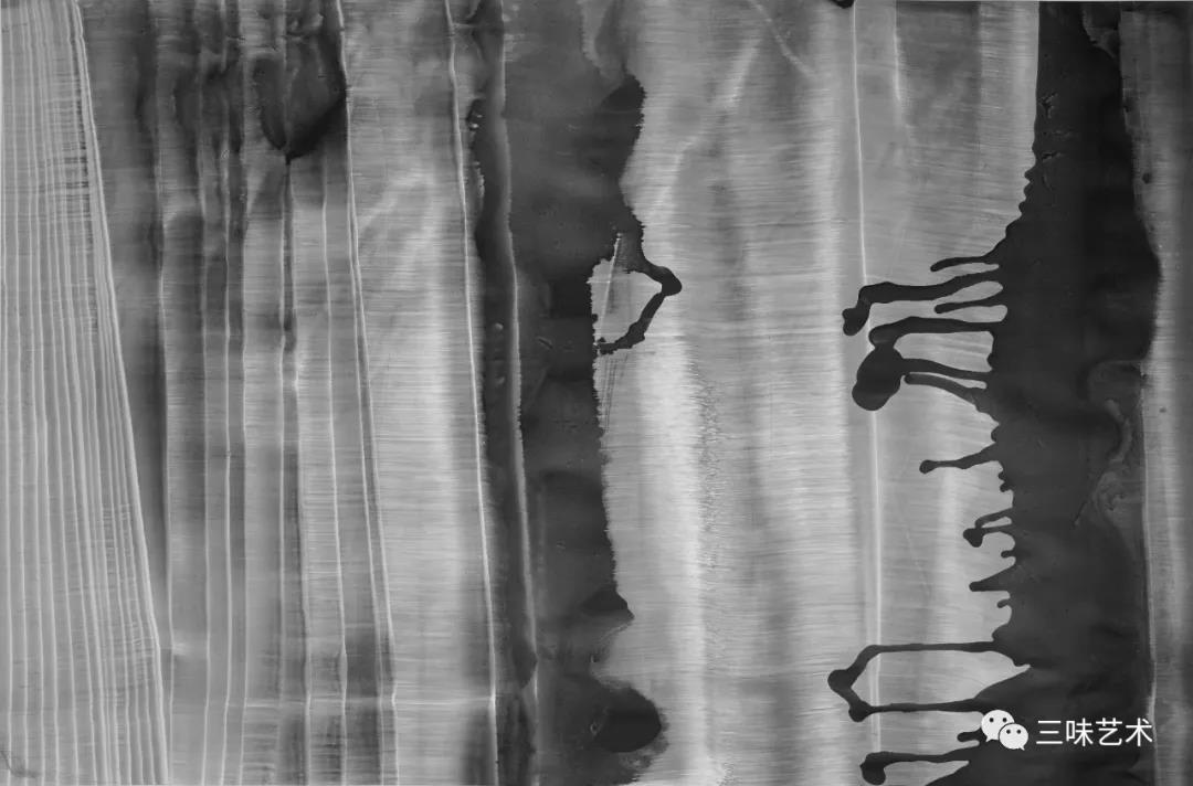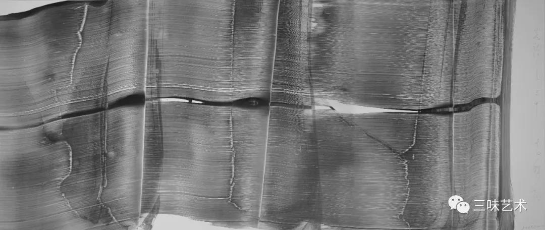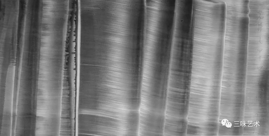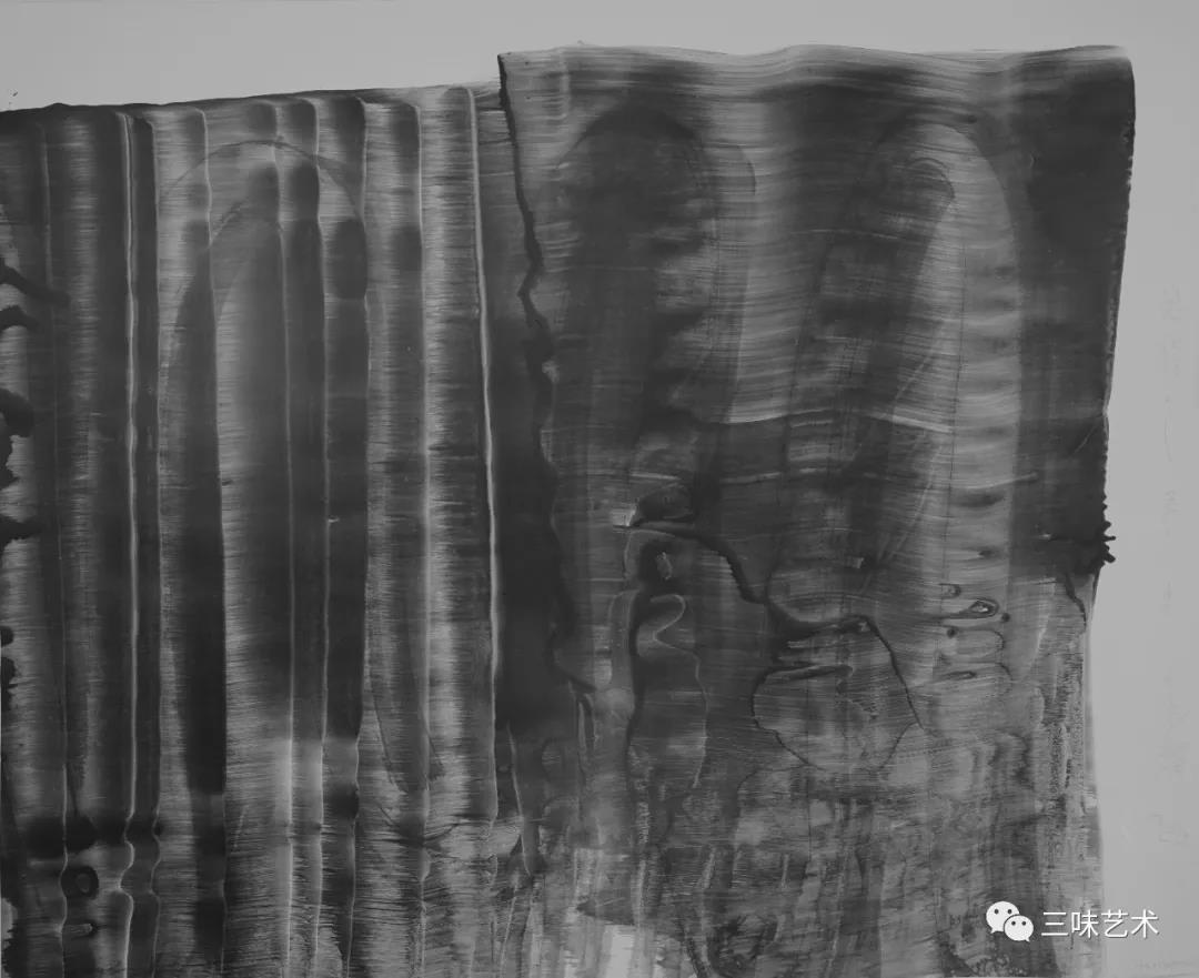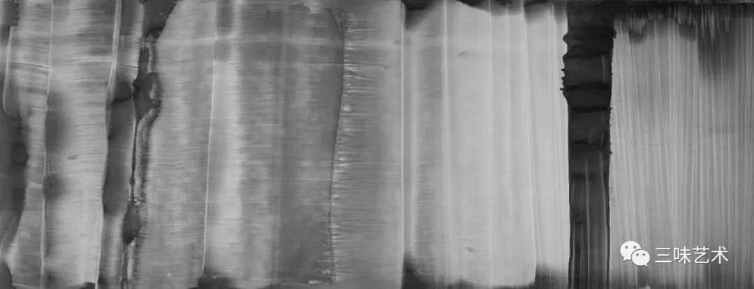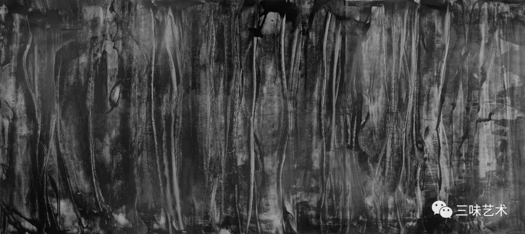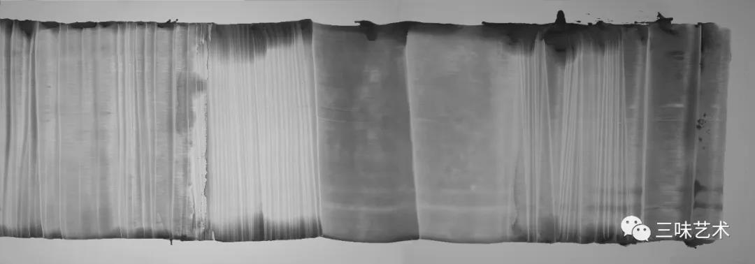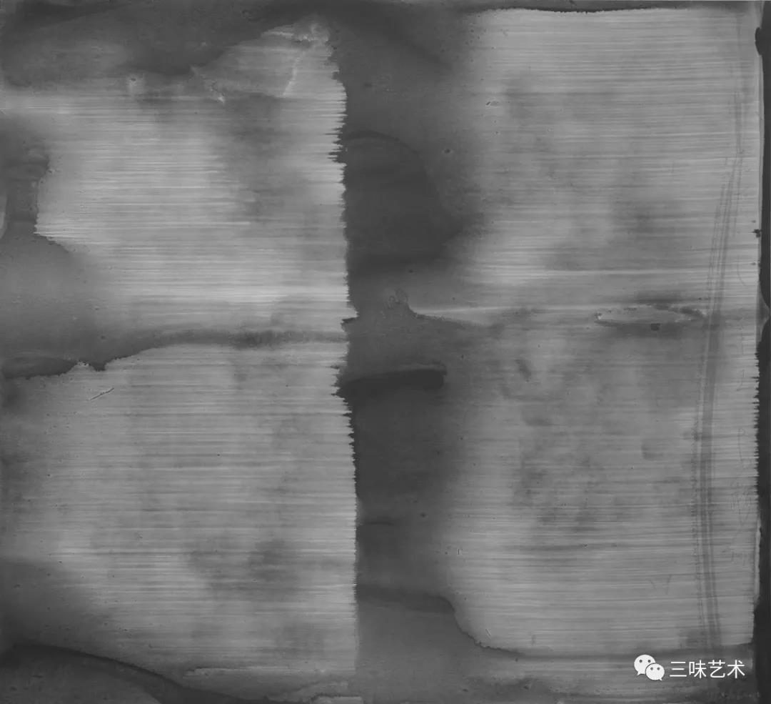 有意思的是,2011年以后,吳國全再次回到了自己創(chuàng)作的原初起點(diǎn)與邏輯關(guān)系之中。資料顯示,他此后既創(chuàng)作了《圖片水墨》系列,也創(chuàng)作了《硬質(zhì)水墨》系列;既創(chuàng)作了《砸墨》系列,也創(chuàng)作了《狂草水墨》系列。與他過去的水墨創(chuàng)作相比,很明顯的是,這些不同系列的作品已經(jīng)偏離了他先前的表現(xiàn)主義創(chuàng)作路線,并且是在往抽象表現(xiàn)的路子上轉(zhuǎn)。另外,吳國全在這些不同系列的思考方面其實(shí)有著很大區(qū)別,這也顯示出他想不斷摸索新創(chuàng)作方向,以獲得學(xué)術(shù)界與收藏界更大程度認(rèn)可的強(qiáng)烈愿望。比如,《圖片水墨》系列在強(qiáng)調(diào)“水墨思維與點(diǎn)、線、面、光的交響”時(shí),意在突出現(xiàn)代影像與水墨表現(xiàn)的結(jié)合;(圖五,選發(fā)《圖片水墨》系列中的作品)《硬質(zhì)水墨》系列在使用新的材料——硬紙與排刷時(shí),意在突出運(yùn)墨過程中所形成的不同矩形圖式與肌理關(guān)系;(圖六,選發(fā)《硬質(zhì)水墨》系列中的作品)而《砸墨》系列則是將水墨表現(xiàn)與行為藝術(shù)結(jié)合了起來,其方法是將墨汁包好后再砸開,這也使得他能夠在大紙、大布、大墻、大地、大木板等媒介上隨意作畫,進(jìn)而追求所謂“表達(dá)方式的革命”。(圖七,選發(fā)《砸墨》系列中的作品)不過,我對(duì)于后者,即《狂草水墨》系列更感興趣。因?yàn)槠洳坏珜鹘y(tǒng)書法或水墨的元素融入了具有象征意味的抽象結(jié)構(gòu)之中,而且特別注意對(duì)瞬間暴發(fā)情感的表達(dá),結(jié)果便給人以完全不同于傳統(tǒng)書法與西方抽象畫的特殊感受。在國內(nèi)一些抽象水墨藝術(shù)家為了學(xué)習(xí)西方抽象藝術(shù)家的畫面圖式與表現(xiàn)手法,不惜消解筆墨表現(xiàn),轉(zhuǎn)而運(yùn)用大潑大染大制作之手法的背景下,他的相關(guān)探索十分具有意義。(圖八,選發(fā)《狂草水墨》系列中的作品)