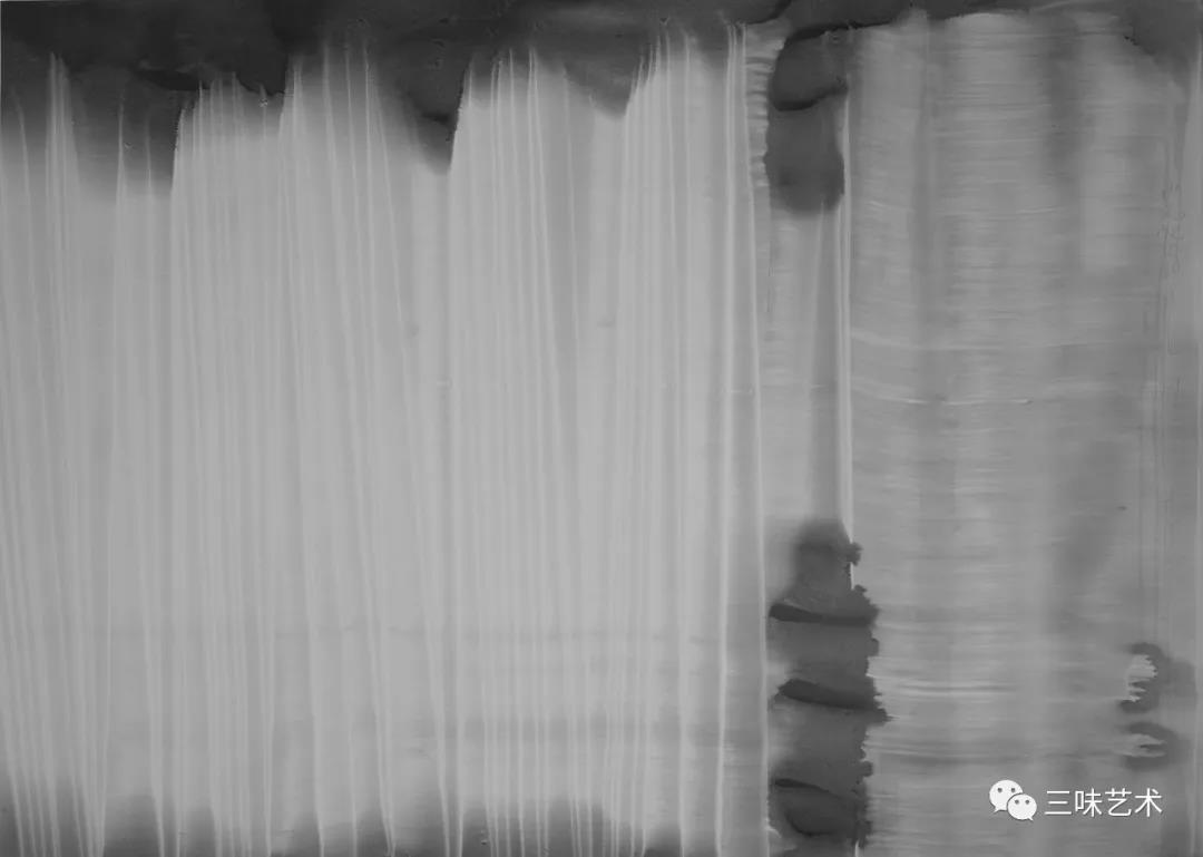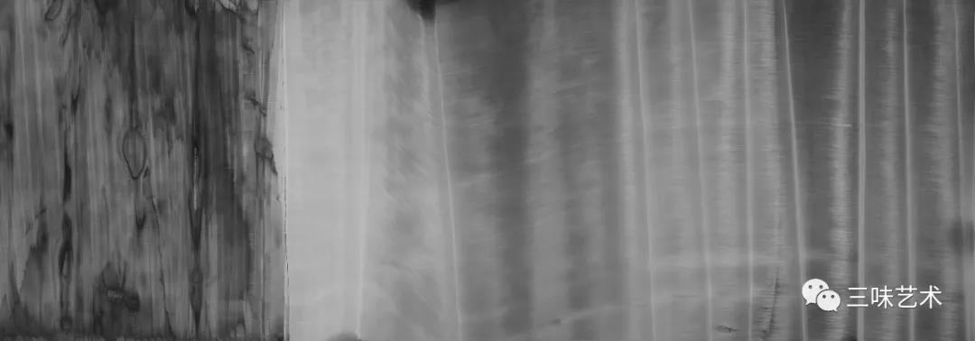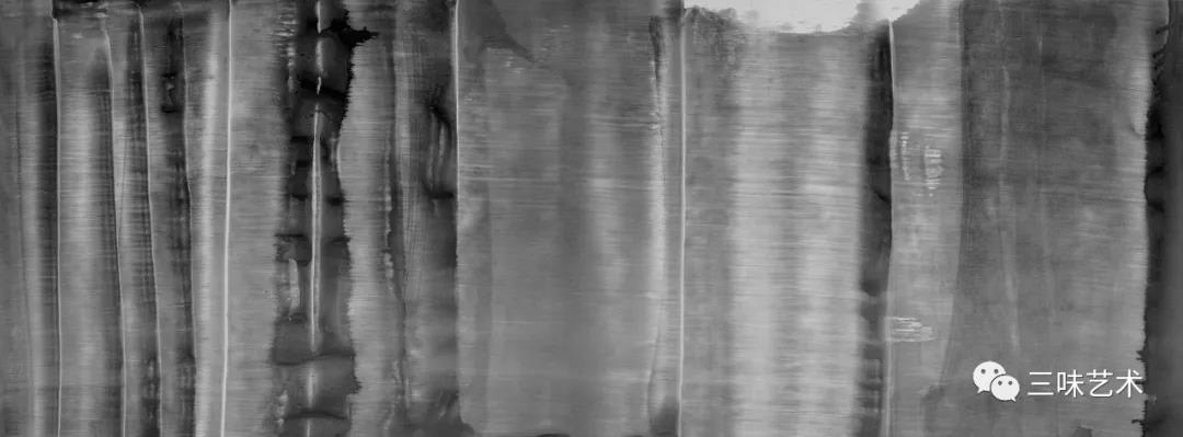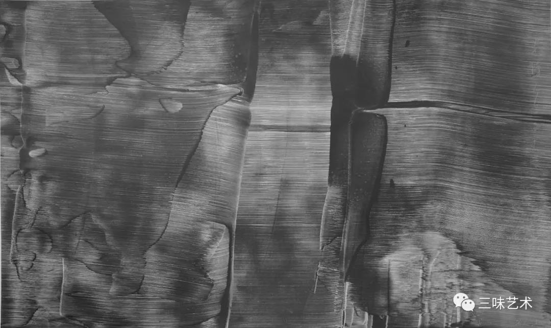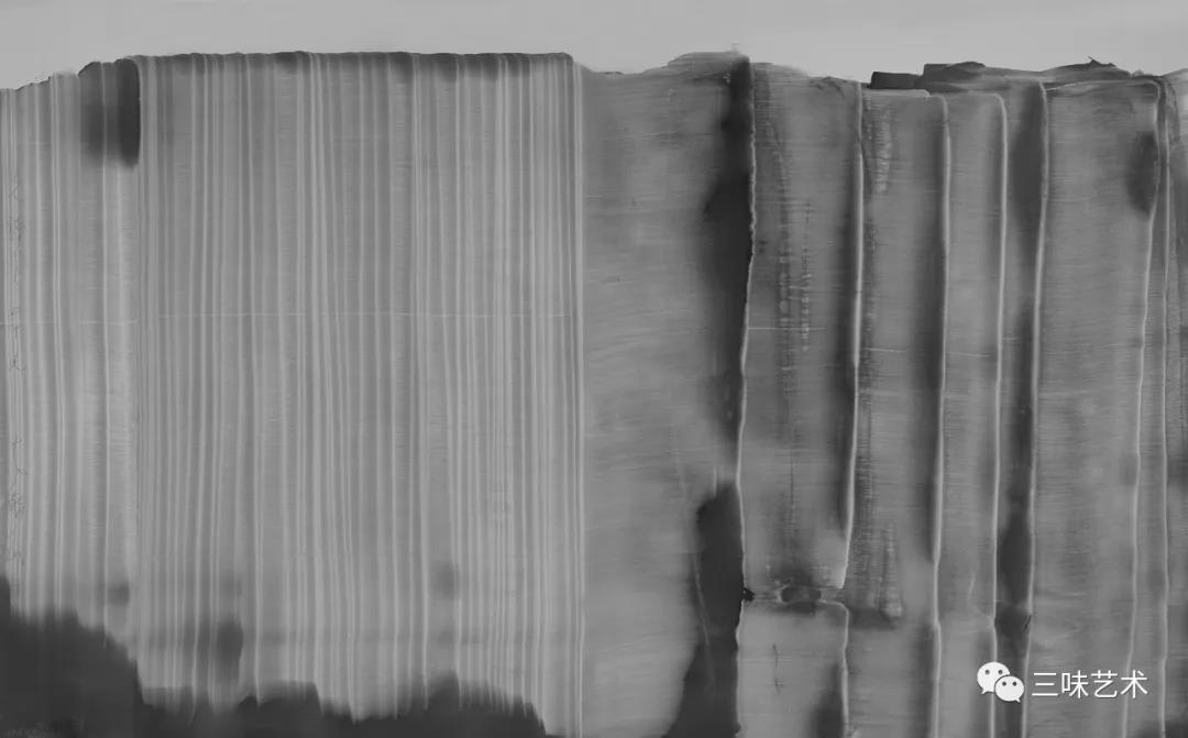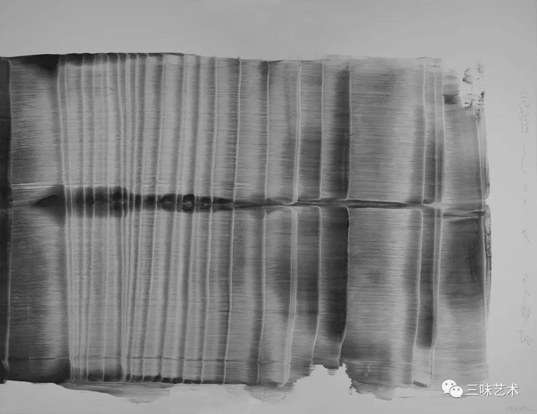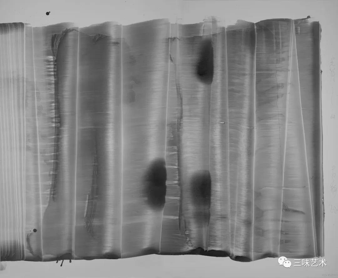 有意思的是,2011年以后,吳國全再次回到了自己創(chuàng)作的原初起點(diǎn)與邏輯關(guān)系之中。資料顯示,他此后既創(chuàng)作了《圖片水墨》系列,也創(chuàng)作了《硬質(zhì)水墨》系列;既創(chuàng)作了《砸墨》系列,也創(chuàng)作了《狂草水墨》系列。與他過去的水墨創(chuàng)作相比,很明顯的是,這些不同系列的作品已經(jīng)偏離了他先前的表現(xiàn)主義創(chuàng)作路線,并且是在往抽象表現(xiàn)的路子上轉(zhuǎn)。另外,吳國全在這些不同系列的思考方面其實(shí)有著很大區(qū)別,這也顯示出他想不斷摸索新創(chuàng)作方向,以獲得學(xué)術(shù)界與收藏界更大程度認(rèn)可的強(qiáng)烈愿望。比如,《圖片水墨》系列在強(qiáng)調(diào)“水墨思維與點(diǎn)、線、面、光的交響”時(shí),意在突出現(xiàn)代影像與水墨表現(xiàn)的結(jié)合;(圖五,選發(fā)《圖片水墨》系列中的作品)《硬質(zhì)水墨》系列在使用新的材料——硬紙與排刷時(shí),意在突出運(yùn)墨過程中所形成的不同矩形圖式與肌理關(guān)系;(圖六,選發(fā)《硬質(zhì)水墨》系列中的作品)而《砸墨》系列則是將水墨表現(xiàn)與行為藝術(shù)結(jié)合了起來,其方法是將墨汁包好后再砸開,這也使得他能夠在大紙、大布、大墻、大地、大木板等媒介上隨意作畫,進(jìn)而追求所謂“表達(dá)方式的革命”。(圖七,選發(fā)《砸墨》系列中的作品)不過,我對(duì)于后者,即《狂草水墨》系列更感興趣。因?yàn)槠洳坏珜鹘y(tǒng)書法或水墨的元素融入了具有象征意味的抽象結(jié)構(gòu)之中,而且特別注意對(duì)瞬間暴發(fā)情感的表達(dá),結(jié)果便給人以完全不同于傳統(tǒng)書法與西方抽象畫的特殊感受。在國內(nèi)一些抽象水墨藝術(shù)家為了學(xué)習(xí)西方抽象藝術(shù)家的畫面圖式與表現(xiàn)手法,不惜消解筆墨表現(xiàn),轉(zhuǎn)而運(yùn)用大潑大染大制作之手法的背景下,他的相關(guān)探索十分具有意義。(圖八,選發(fā)《狂草水墨》系列中的作品)