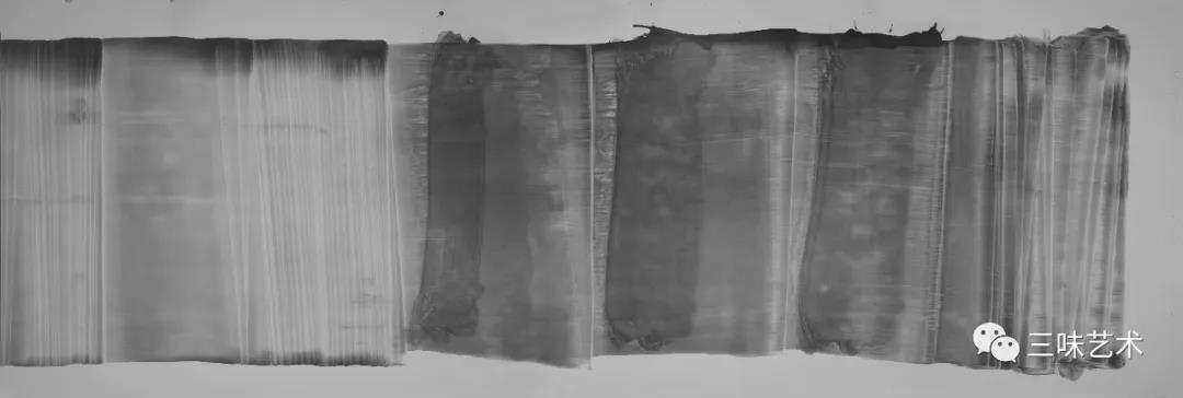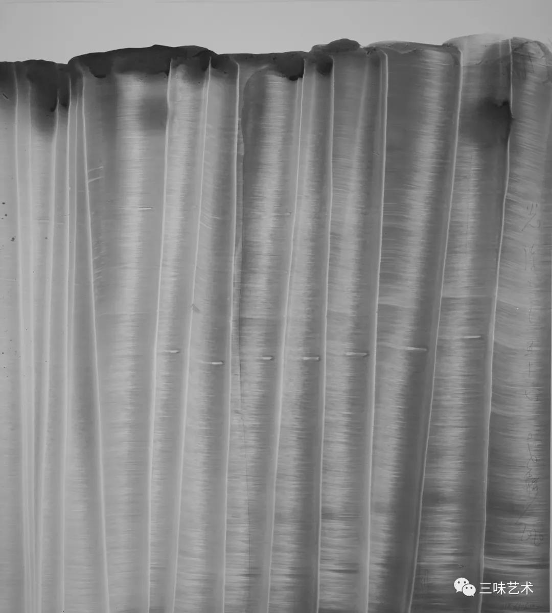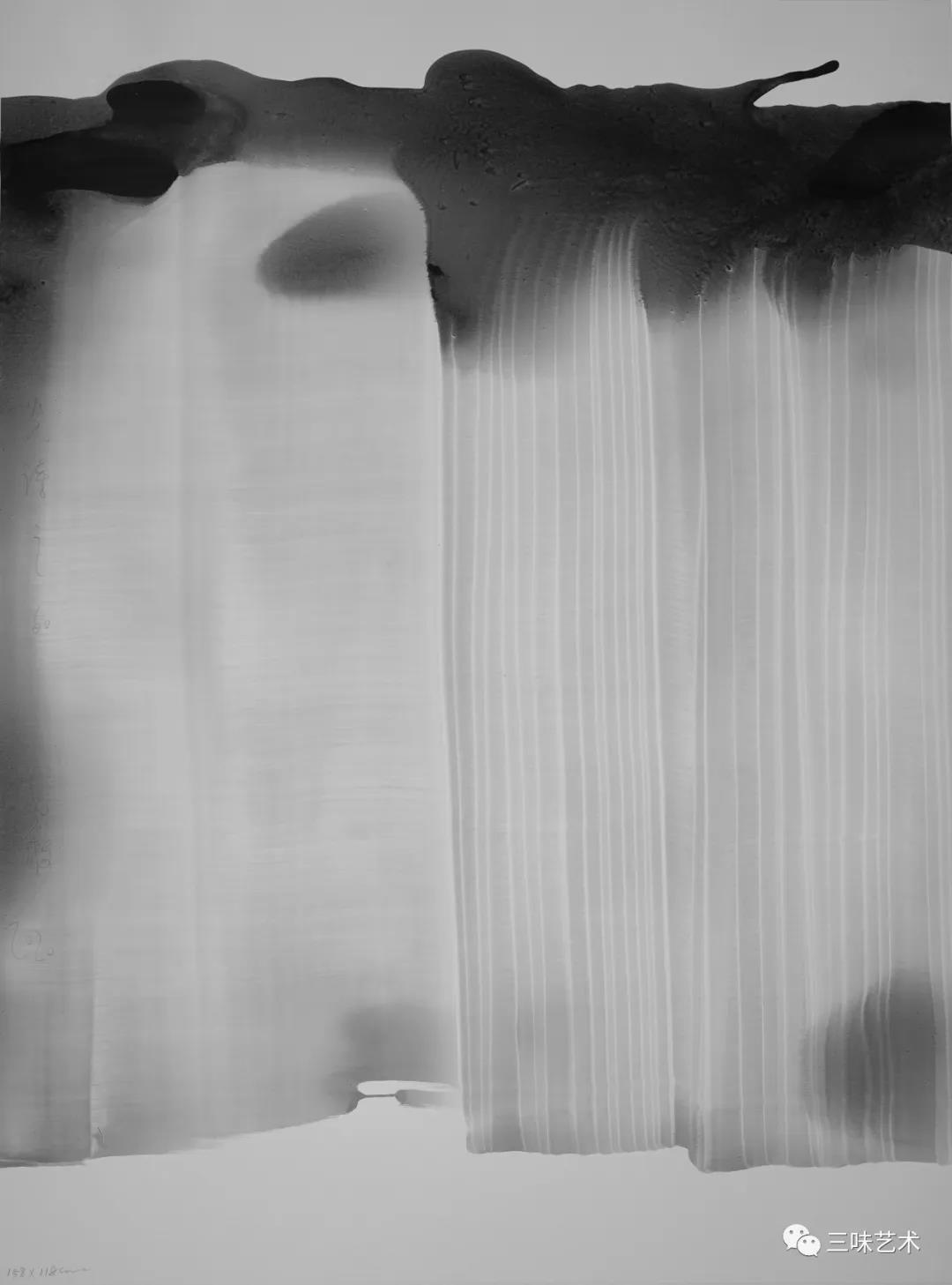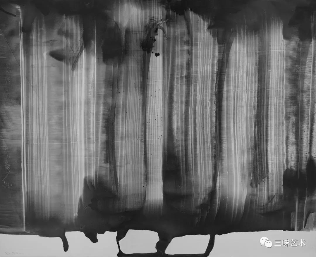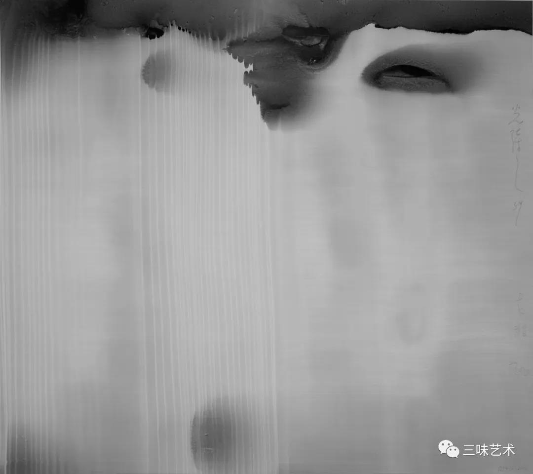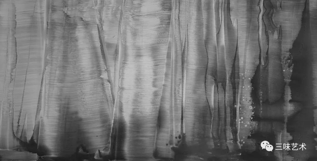 有意思的是,2011年以后,吳國全再次回到了自己創(chuàng)作的原初起點(diǎn)與邏輯關(guān)系之中。資料顯示,他此后既創(chuàng)作了《圖片水墨》系列,也創(chuàng)作了《硬質(zhì)水墨》系列;既創(chuàng)作了《砸墨》系列,也創(chuàng)作了《狂草水墨》系列。與他過去的水墨創(chuàng)作相比,很明顯的是,這些不同系列的作品已經(jīng)偏離了他先前的表現(xiàn)主義創(chuàng)作路線,并且是在往抽象表現(xiàn)的路子上轉(zhuǎn)。另外,吳國全在這些不同系列的思考方面其實(shí)有著很大區(qū)別,這也顯示出他想不斷摸索新創(chuàng)作方向,以獲得學(xué)術(shù)界與收藏界更大程度認(rèn)可的強(qiáng)烈愿望。比如,《圖片水墨》系列在強(qiáng)調(diào)“水墨思維與點(diǎn)、線、面、光的交響”時(shí),意在突出現(xiàn)代影像與水墨表現(xiàn)的結(jié)合;(圖五,選發(fā)《圖片水墨》系列中的作品)《硬質(zhì)水墨》系列在使用新的材料——硬紙與排刷時(shí),意在突出運(yùn)墨過程中所形成的不同矩形圖式與肌理關(guān)系;(圖六,選發(fā)《硬質(zhì)水墨》系列中的作品)而《砸墨》系列則是將水墨表現(xiàn)與行為藝術(shù)結(jié)合了起來,其方法是將墨汁包好后再砸開,這也使得他能夠在大紙、大布、大墻、大地、大木板等媒介上隨意作畫,進(jìn)而追求所謂“表達(dá)方式的革命”。(圖七,選發(fā)《砸墨》系列中的作品)不過,我對(duì)于后者,即《狂草水墨》系列更感興趣。因?yàn)槠洳坏珜鹘y(tǒng)書法或水墨的元素融入了具有象征意味的抽象結(jié)構(gòu)之中,而且特別注意對(duì)瞬間暴發(fā)情感的表達(dá),結(jié)果便給人以完全不同于傳統(tǒng)書法與西方抽象畫的特殊感受。在國內(nèi)一些抽象水墨藝術(shù)家為了學(xué)習(xí)西方抽象藝術(shù)家的畫面圖式與表現(xiàn)手法,不惜消解筆墨表現(xiàn),轉(zhuǎn)而運(yùn)用大潑大染大制作之手法的背景下,他的相關(guān)探索十分具有意義。(圖八,選發(fā)《狂草水墨》系列中的作品)