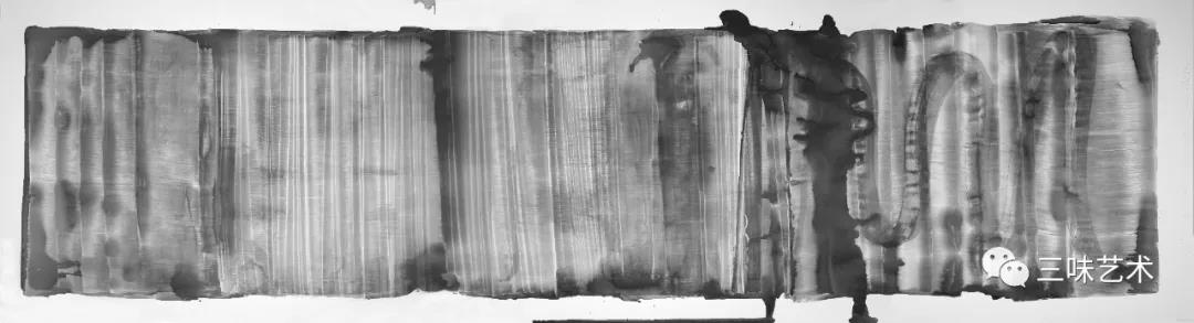 正如大家所見,吳國全的《狂草水墨》系列在構(gòu)圖上除用了少量條幅的方式外,更多是采取橫卷的方式。而那以粗重筆墨處理的畫面,常常給人以沉甸甸的感覺,既表達(dá)了藝術(shù)家馳騁的心理,也充滿著自由的襟懷。而在具體的創(chuàng)作過程中,他首先是大膽地將種種漢字字符打散后作為整體空間的基本素材予以自由化處理;其次是對(duì)于線條的表現(xiàn)特別用心,我注意到,他雖然更多是以行草書般的筆意處理畫面,但有時(shí)卻會(huì)以隸書般的筆意,有時(shí)又會(huì)以篆書般的筆意進(jìn)行表現(xiàn)。與此同時(shí),他特別強(qiáng)調(diào)純粹的線條美、筆勢美、造型美、墨韻美、構(gòu)成美;再其次,他還會(huì)有意用筆墨的盤旋往復(fù)、重疊交錯(cuò)、濃淡變化、干濕對(duì)比、粗細(xì)處理等不同方式安排畫面的空間關(guān)系與章法構(gòu)成,結(jié)果就造成了一種音樂般的和聲效果。有一點(diǎn)必須提及,即他還特別注意水墨畫那一次性完成或不可修改的特點(diǎn)。而這既使他的作品氣貫筆端,氣息悠長,也使其明顯突現(xiàn)出順序感與時(shí)間感,相信但凡受過相關(guān)訓(xùn)練的的觀眾通過作品中那筆的重疊、承接與墨色變化,將不難體會(huì)到藝術(shù)家在創(chuàng)作時(shí)的用筆過程。從藝術(shù)史的角度看,這種做法非常重要。事實(shí)上,美國抽象表現(xiàn)藝術(shù)家托比就從中國傳統(tǒng)書法強(qiáng)調(diào)時(shí)間因素的做法中,成功地發(fā)展出了“自動(dòng)繪畫”的概念。?這一藝術(shù)概念重視直覺與偶然因素的作用,追求繪畫的自然生長過程。其對(duì)后來出現(xiàn)的波洛克等人有重大的影響。當(dāng)然,如果以世界藝術(shù)史為線索,我們還會(huì)發(fā)現(xiàn):吳國全在很大程度上,已經(jīng)巧妙地將西方現(xiàn)代藝術(shù)——主要是抽象主義,還有表現(xiàn)主義、立體主義藝術(shù)的若干特點(diǎn),如對(duì)造型性的追求、對(duì)表現(xiàn)至上的追求、對(duì)平面構(gòu)成的追求很自然地融入其中。由是,他的《狂草水墨》系列作品與傳統(tǒng)藝術(shù)也形成了若即若離的關(guān)系。打個(gè)不太恰當(dāng)?shù)谋扔靼?,這兩者就像父子關(guān)系一樣。兒子雖然與父親有著血緣上的關(guān)系,但決不是父親本身,他就是他自己,更有著自己的特點(diǎn)。吳國全給我們的深刻啟示是:在推進(jìn)傳統(tǒng)水墨向現(xiàn)代水墨轉(zhuǎn)換的歷史進(jìn)程中,一定要超越東西方二元對(duì)立的價(jià)值模式。即一方面要大膽學(xué)習(xí)西方藝術(shù)中有價(jià)值的東西;另一方面還要努力從傳統(tǒng)藝術(shù)中尋求具有現(xiàn)代因素的東西。但這一切只有在多元文化的碰撞與交融中才可以做到。與此相反,頑固堅(jiān)守單一的、原生態(tài)的民族價(jià)值觀念的做法,或者是盲目模仿西方現(xiàn)代藝術(shù)的做法,都是斷不可取的。