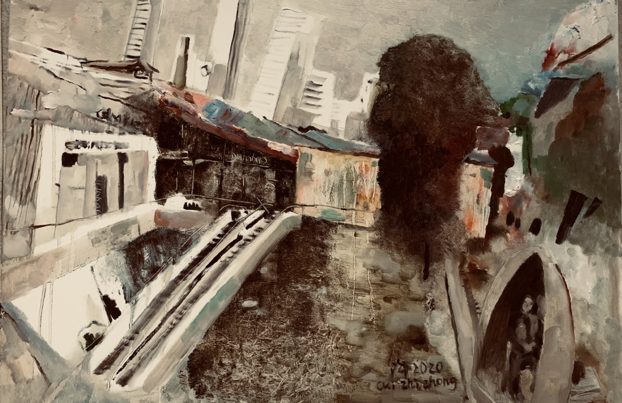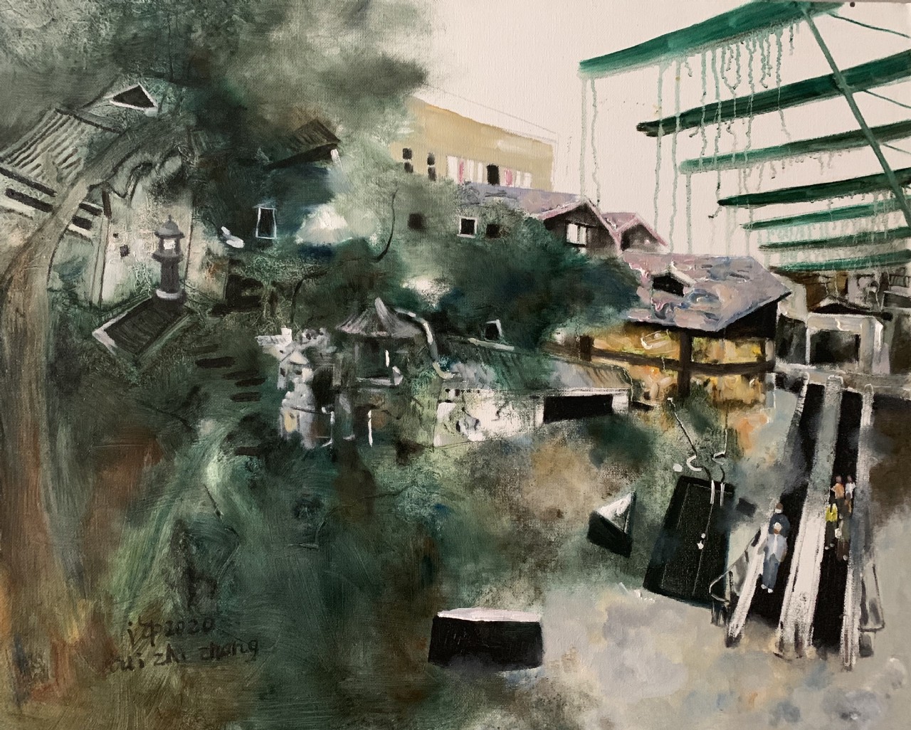 我想這就是畫家的深意所在,因為成都的年齡決定了它的豐饒內(nèi)蘊,你畫出任何一件具象的東西,都立刻會有遺落其它東西的遺憾,與其掛一漏萬,不如混沌包容。一即萬,萬即一,有無相生,虛實互滲,于是畫上的成都就是現(xiàn)實中真實的成都,它神秘但有輪廓,朦朧然而有精骨,畫上的成都擔(dān)當(dāng)?shù)闷鹫鎸嵉某啥嫉呢S富內(nèi)涵,因為古往今來的成都就是活生生的,是原生的又是變化無窮的,它有呼吸有成長有情致,時刻都是它又時刻不是它,畫家為了讓它不固化于某一刻而永遠有生機,于是呈現(xiàn)出眼前這種間離的效果。