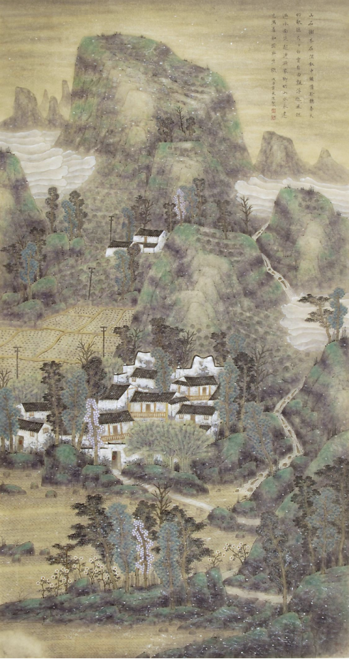 《溪前春光山乍暖》(120cm×210cm)滿目青山過濾成飄渺的黃昏意象。流云蕩逸其間,黑瓦素壁,民屋數(shù)椽,流泉在山道中蜿蜒,雜樹錯(cuò)落其間,天幕低垂,暮色蒼茫,偶有梵音掠過……畫家在默默地詮釋著生命的靜美與廣袤原野的蒼涼。“沙鷗翔集,錦鱗游泳”那豪氣干云的萬千氣象已凈化為萬頃波平微風(fēng)蕩漾的詩意棲居之所?!锻烁€林造山川之美》(180cm×120cm)讓我想起日本繪畫巨匠東山魁夷的滿目流彩、翠意重疊的佳山秀水。楊天生先生以空靈不乏逸致的淡定,完成墟里孤煙暮歸老牛的民俗風(fēng)情:以出世的心態(tài)寫入世的幻象。退耕還林之美,抑或是陶潛式的隱遁,還是充耳不聞的大隱隱于市呢?群山高聳,萬籟俱寂的家山還始終保留生態(tài)示范的原始之韻嗎?如果說前者凸顯并放大了山水唯美主義者的風(fēng)情萬種,那么,后者的描繪與寫真則更多地帶有冷雋委婉孤峭之美,綠灰淺絳的格局里,彌漫著鄉(xiāng)情;飄逸著詩思,紛繁著無盡的想象:在這家山的數(shù)里之外,轟隆著機(jī)鳴與排泄著工業(yè)廢水,日夜?jié)B透著大地的肢體呵,我的家山。