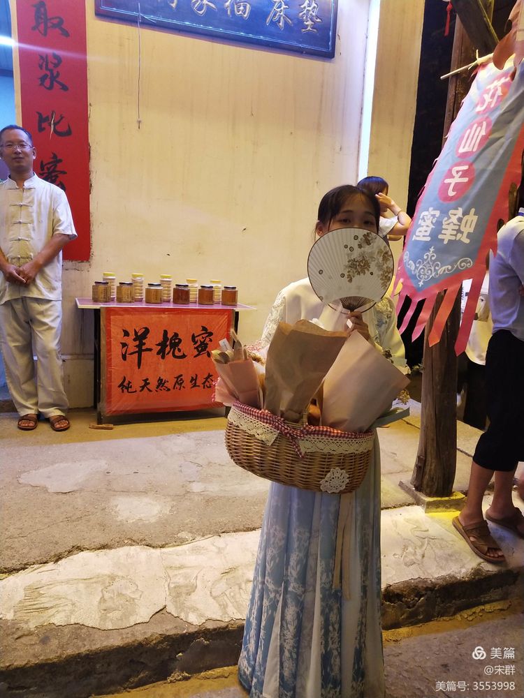 這兒有賣糖水的,像蔬果店鋪,那里總會(huì)圍著一群嘰嘰喳喳身著盛裝的孩子們,等一杯心儀的甜品到手之后,他們便踏著星光,拋下一串銀鈴般的笑聲跑遠(yuǎn)了,披在他們身上的,分不清是燈光還是星光。 站在穿著漂亮漢服的人們中間,有一種恍若夢(mèng)境的穿越之感。