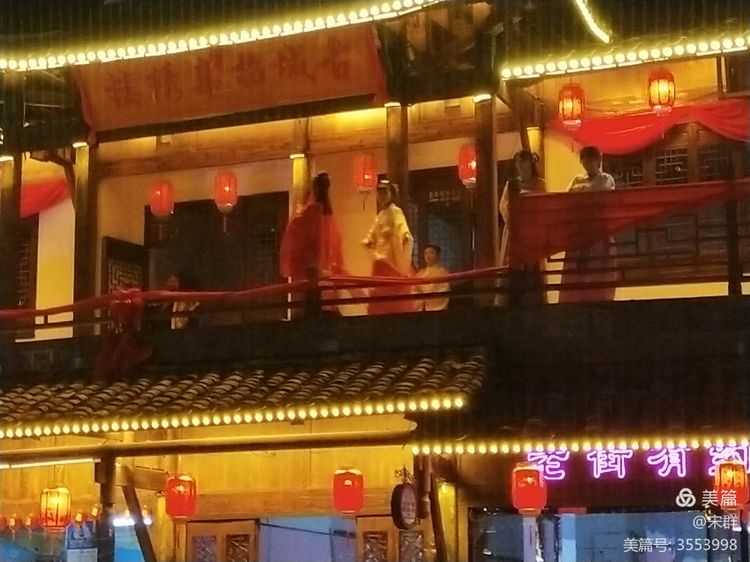 人流如織的古街,歌聲叫賣聲,吆喝聲此起彼伏,時(shí)不時(shí)的,會(huì)隨風(fēng)送來一陣陣悠遠(yuǎn)空靈的古琴之音。一串串穿透力極強(qiáng)的紅燈籠,在夜色的襯托下格外醒目,似乎比星光還要迷人。