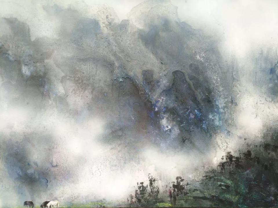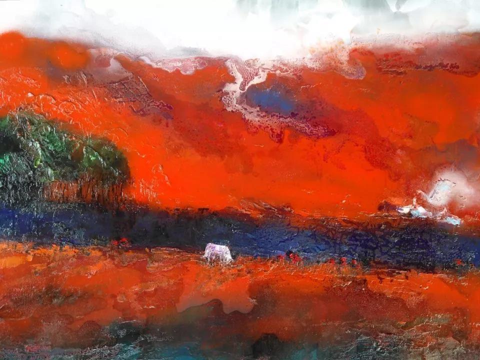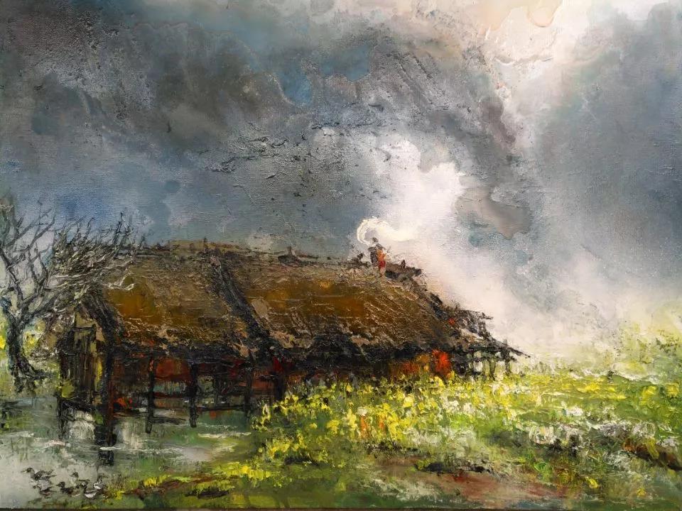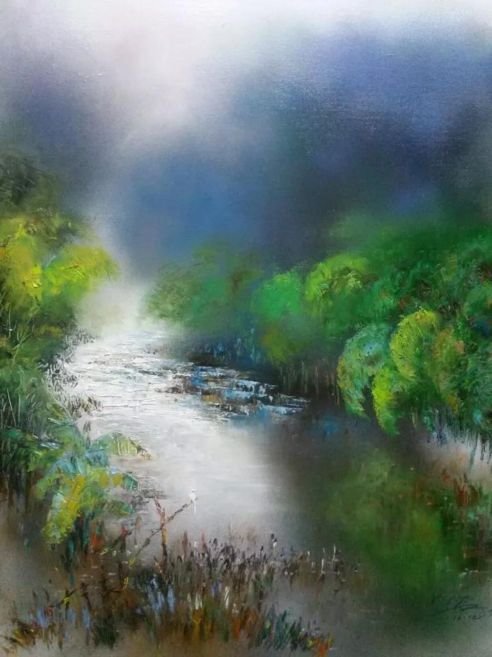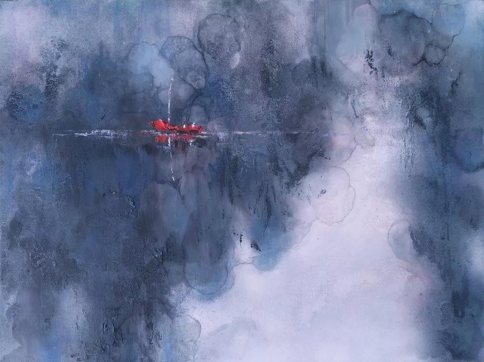在創(chuàng)作上,余劍鋒很好的理解到了這一點(diǎn)。基于油畫的物質(zhì)基礎(chǔ)之上,利用獨(dú)有的技法打破了傳統(tǒng)西方繪畫嚴(yán)謹(jǐn)?shù)臉?gòu)圖法則、光影法則與色彩法則,進(jìn)而營造出了兼具婉約與豪放,惋嘆與蒼茫,真實(shí)與縹緲的東方意韻。
