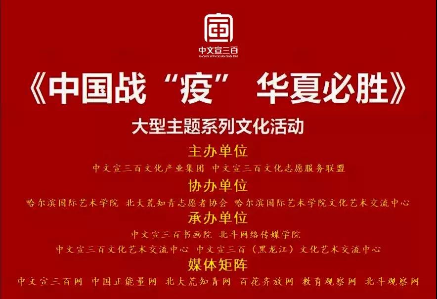 由中文宣三百文化產(chǎn)業(yè)集團(tuán)發(fā)起“中國戰(zhàn)疫,華夏必勝”活動(dòng),旨在通過在線網(wǎng)絡(luò)文學(xué)藝術(shù)作品的征集、展示,生動(dòng)講述防疫抗疫一線的感人事跡,講好中國抗擊疫情故事,展現(xiàn)中國人民團(tuán)結(jié)一心、同舟共濟(jì)的精神風(fēng)貌,凝聚眾志成城抗疫情的強(qiáng)大力量。活動(dòng)啟動(dòng)以來,受到各方面廣泛關(guān)注。尤其受到來自全國各地藝術(shù)家們的歡迎,短短一周時(shí)間就收到書畫作品、篆刻作品、詩歌作品、攝影作品近千件。充分表達(dá)了藝術(shù)家和文藝工作者凝心聚力,共戰(zhàn)疫情,為堅(jiān)決打贏疫情防控阻擊戰(zhàn)鼓與呼。藝術(shù)家們拿起手中的筆,發(fā)揮文學(xué)藝術(shù)的力量和作用,凝聚強(qiáng)大的精神動(dòng)力,共同戰(zhàn)勝疫魔。
