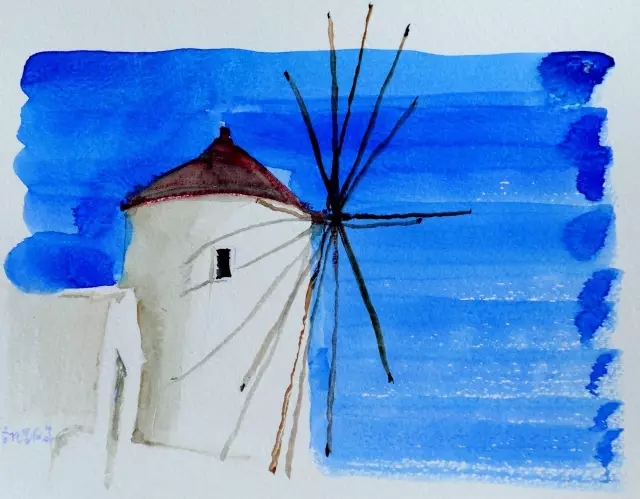 傍晚,海風輕輕撫過葉輪,風車緩緩轉動,吱嘎的響聲喚起人們關于一座白色村莊的想象。此刻的驕陽已不再火辣辣地令人頭暈目眩,潔白的墻腳下生出幾道淺淺的陰影,仿佛陽光離去時留下的腳印。