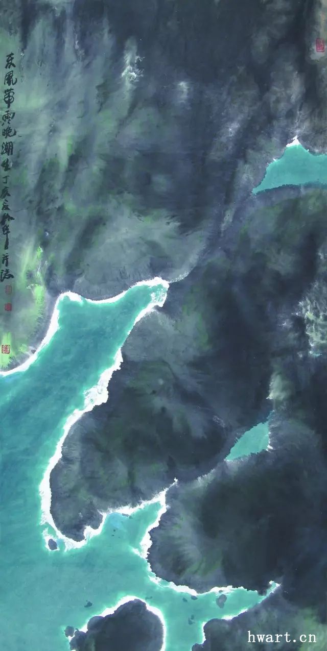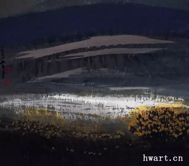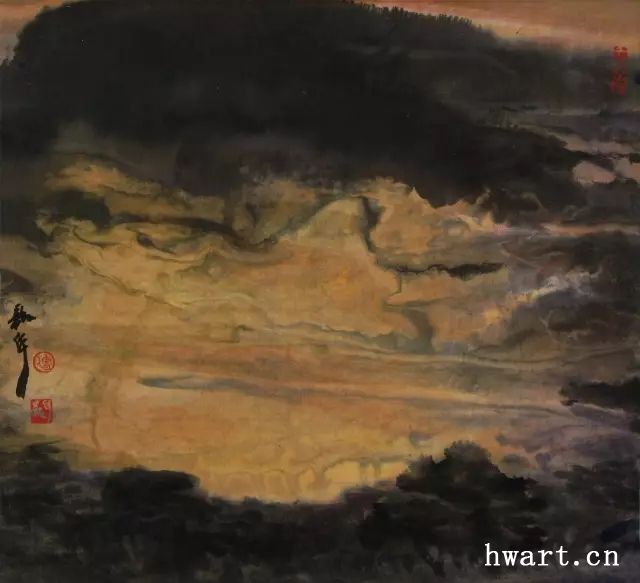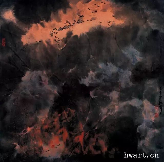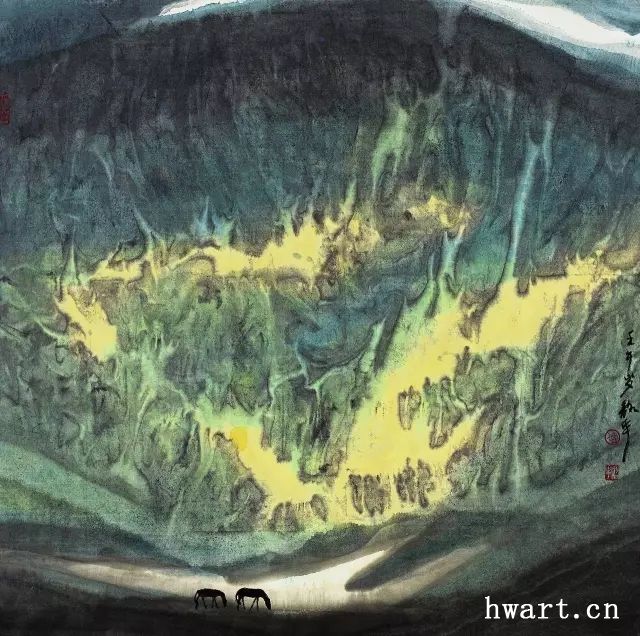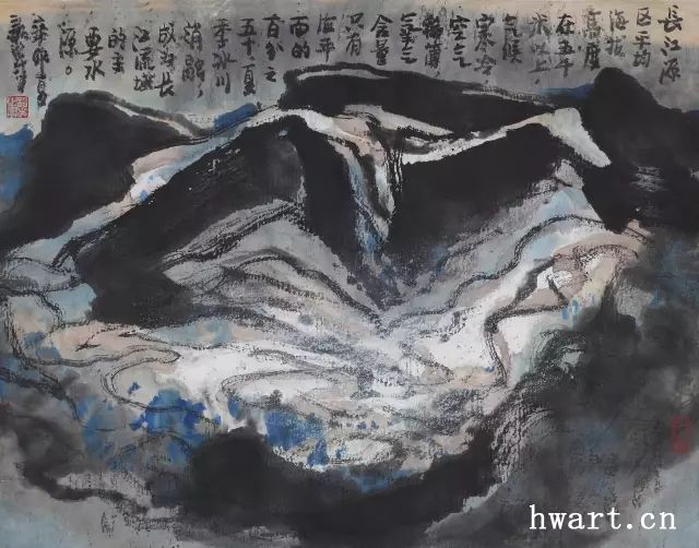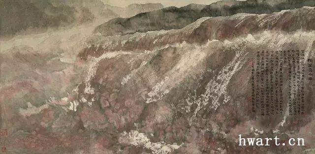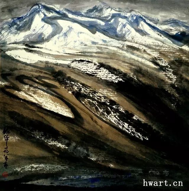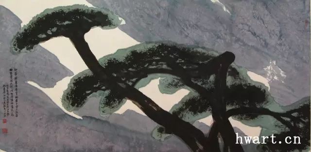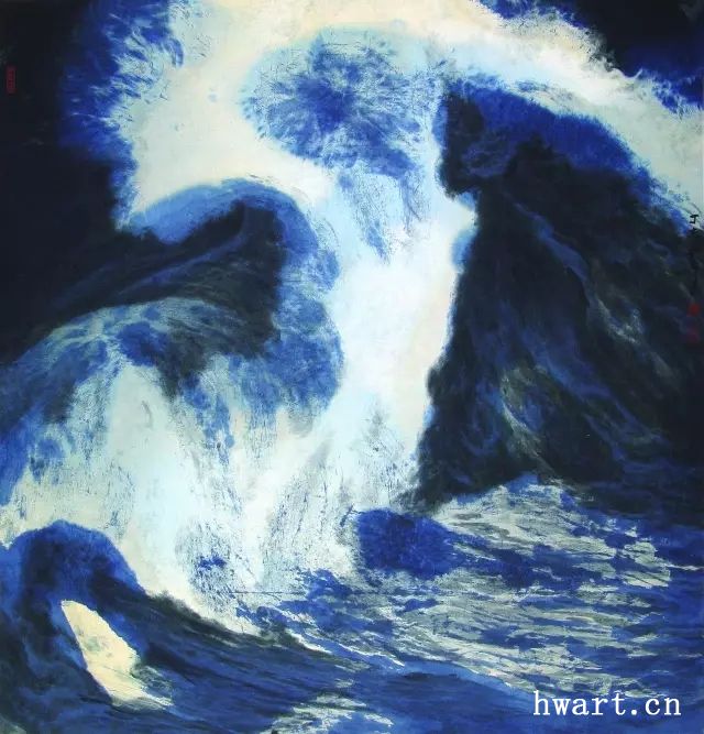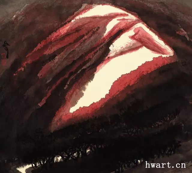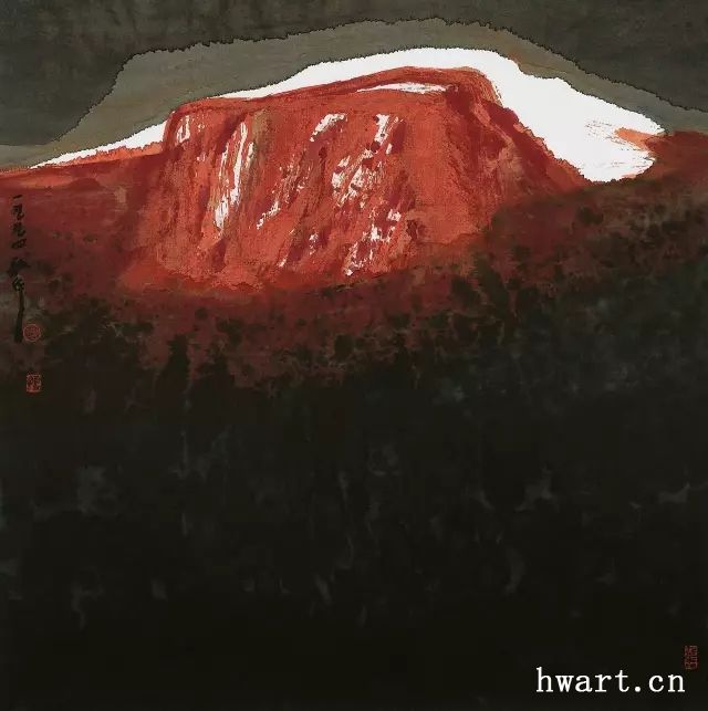 他之所以能夠成為改革開放時(shí)期代表性水墨畫家,是因?yàn)樗谛碌臅r(shí)代對(duì)以往的主流山水畫在傳承中又進(jìn)行了大幅度的改革,這突出表現(xiàn)在他對(duì)現(xiàn)代性和現(xiàn)代轉(zhuǎn)型的明確追求,為此他淡化了寫實(shí)性強(qiáng)化了寫意性,淡化了具象性強(qiáng)化了抽象性,淡化了敘事性強(qiáng)化了象征性,淡化了政治性強(qiáng)化了文化性。他不僅將大山大水視為江山社稷的象征,而且將其視為“獨(dú)與天地精神往來”(莊子語)的載體;不僅禮贊山水的雄偉壯闊,而且以有力的結(jié)構(gòu)、明快的色彩和大寫意的筆法抒發(fā)胸中的浩然之氣;不僅擔(dān)當(dāng)大時(shí)代精神,而且擔(dān)當(dāng)中華文化精神和大宇宙精神。對(duì)于這種正面弘揚(yáng)超大靈魂,充滿理想主義和英雄主義的美學(xué)追求,周韶華稱之為“大美”。