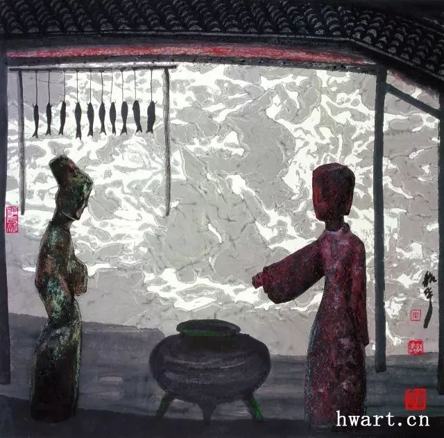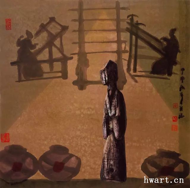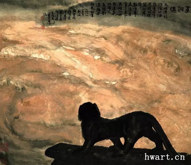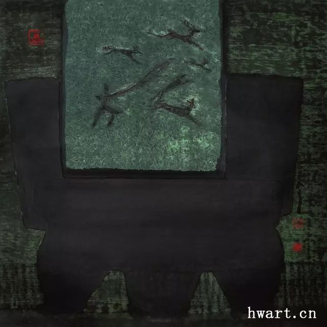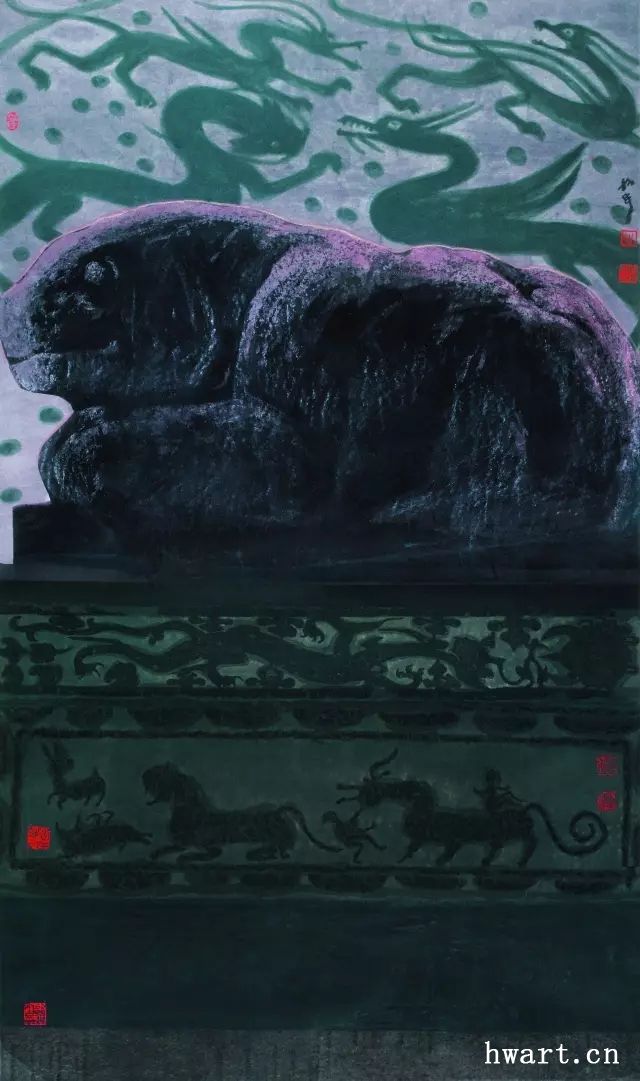 “人”,指挪移和延展人文產(chǎn)品圖像的作品,包括中國古代文物、民間藝術(shù)、兒童藝術(shù)的圖像等。稱之為“挪移”,因?yàn)樗幌癞吋铀髦诜侵匏囆g(shù),改頭換面拿來我用;也不像自己的山水畫,對(duì)物象進(jìn)行大幅度意象化改造。在這類作品中,周韶華常常放棄寫意轉(zhuǎn)而以寫實(shí)手法直接畫文物,或直接搬用民間和兒童藝術(shù)圖像,甚至直接拼貼畫像石拓片原件。在挪移中也有一定幅度的改造,首先是將雕塑等轉(zhuǎn)化為水墨宣紙的畫面,其次是人文產(chǎn)品圖像常與抽象構(gòu)成互嵌,第三是并置組合若干種人文產(chǎn)品圖像產(chǎn)生一種異趣,第四是在人文圖像的背景前描繪歷史人物。這是一種很少有人嘗試過的作畫方式,周韶華顯然是在冒險(xiǎn)。就我個(gè)人的理解,這里最成功的是周韶華的成名作《黃河魂》。在這件作品中,周韶華將藏于西安碑林博物館的東漢鎮(zhèn)墓神獸搬到了千里之外的壺口瀑布前,讓象征中華文化的大型石雕和象征中華民族的黃河組合成一種新的意象,而且情與景會(huì),意與境渾,天衣無縫,不留痕跡。