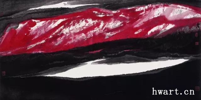 “地”,指山水畫,是周韶華成就最高的創(chuàng)作領(lǐng)域?!兑固教乒爬肥侵苌厝A的拔萃之作,此作無依無傍而又無懈可擊,似版畫卻有毛筆筆意,交錯(cuò)橫貫的濃墨長線如漢隸魏碑刀劈斧刻,作品不著色不畫光,卻有荒寒的夜光意境。周氏大山多有動(dòng)勢(shì),此為一例?!洞竽聘琛废盗谐晒χ幵谟跈C(jī)械造型與現(xiàn)代構(gòu)成的撞合,人文景觀與自然景觀的撞合,冷抽象與熱抽象的撞合,理性構(gòu)成與寫意筆法撞合。要點(diǎn)不在合,而在合之妙。周氏結(jié)構(gòu)單純大氣,用色簡略強(qiáng)烈,此為一例。《神游母親河》、《山島竦峙》、《玉龍山脈》、《白云巖》、《世界屋脊之一》、《碧海潮涌》等作品中斗筆抒寫的疾筆闊線很有特色,石鼓大篆筆意與吳昌碩、齊白石有上下文關(guān)系,但更放縱更無序;中鋒筆意猶在,但又時(shí)而側(cè)掃時(shí)而逆出;使筆完全不理會(huì)“不過腰”的古訓(xùn),大提大按肆意鋪毫甚至直達(dá)筆根。正筆與破鋒相互絞轉(zhuǎn),壯毫與爽墨一氣呵成;外合山水的大塊構(gòu)造,內(nèi)發(fā)胸中的激越豪情。