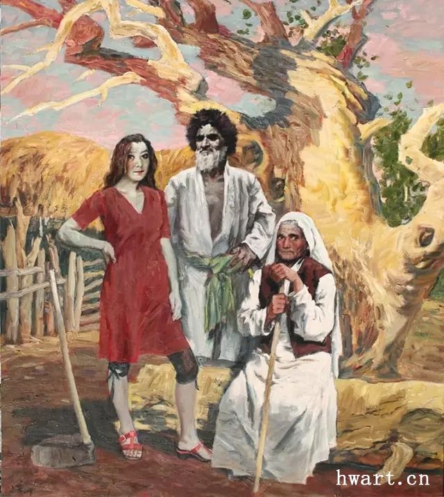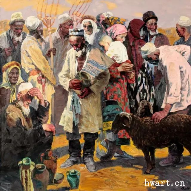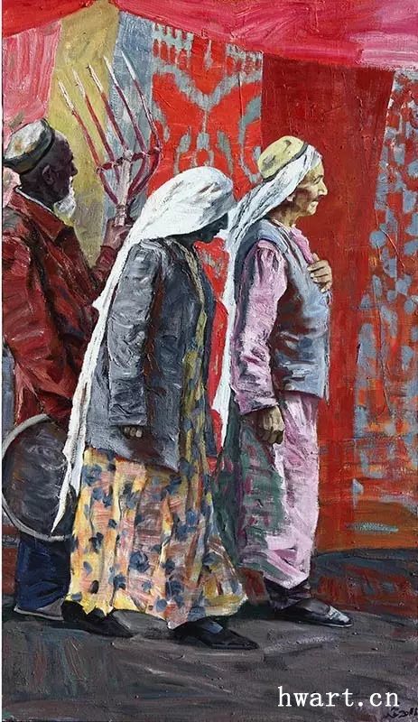 著名畫(huà)家哈孜·艾買(mǎi)提的《罪惡的審判》(1964年作)、《木卡姆》(1984年作)等作品均是極好的例證。以《罪惡的審判》為例:作者采用了(批判)現(xiàn)實(shí)主義且具戲劇性的表現(xiàn)手法,使作品栩栩如生。它呈環(huán)形構(gòu)圖,以人物為主,以天空、建筑物等為輔,通過(guò)人物的分組、布局、安排,使主要人物更好的體現(xiàn)作品主題。作者巧妙的利用了畫(huà)面中的臺(tái)階,在視覺(jué)上完成了空間盛大、高低錯(cuò)落和人物表情的變化。通過(guò)表現(xiàn)畫(huà)中的黑心宗教法官——卡孜、依瑪木及其走卒從臺(tái)階高處向低處行走的態(tài)勢(shì),在思想內(nèi)容上預(yù)示了剝削統(tǒng)治階級(jí)走向衰亡沒(méi)落。從卡孜身旁因害怕眾人而夾尾逃竄的狗,也能看出狗的主人——卡孜雖然外表驕橫狂妄,背著雙手下臺(tái)階,但實(shí)際上卻十分懼怕周?chē)勖芭?、緊握雙拳、憤怒之火仿佛立即噴發(fā)的勞動(dòng)群眾??ㄗ紊砼缘囊垃斈?,兩人系一丘之貉,其人形體動(dòng)態(tài),也充分體現(xiàn)了他的狡詐、利用宗教敲詐、殘害百姓的本性。若對(duì)作品進(jìn)行深入分析,似乎可以詮釋出一部小說(shuō),因?yàn)樽髌分械拿總€(gè)人物都個(gè)性鮮明,顯示了他們所具有的職業(yè)、社會(huì)地位、社會(huì)經(jīng)歷以及社會(huì)背景。畫(huà)家哈孜·艾買(mǎi)提籍貫喀什噶爾,出生宗教人士之家,幼時(shí)就讀于宗教學(xué)堂,多見(jiàn)多識(shí),后來(lái)又受到專(zhuān)業(yè)知識(shí)的熏陶,他深知世事滄桑、人情冷暖,經(jīng)歷豐富,因而畫(huà)家不僅具有豐富的生活閱歷,也具有相當(dāng)廣博的人文知識(shí)。從另一方面講,因?yàn)楣巍ぐI(mǎi)提具有堅(jiān)實(shí)的基本功,因而能夠自如的創(chuàng)造藝術(shù)形象,