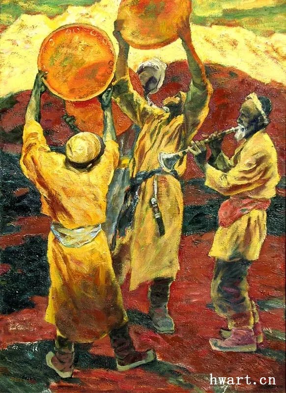 繪畫(huà)藝術(shù)和音樂(lè)藝術(shù)具有親緣關(guān)系并互相影響或互為補(bǔ)充。一幅精彩的畫(huà)作宛如一首優(yōu)美樂(lè)曲,聆聽(tīng)一首優(yōu)秀音樂(lè)作品,激動(dòng)興奮之際,也使你眼前浮現(xiàn)出一幅畫(huà)面……所以,西方有“繪畫(huà)是凝固的音樂(lè),音樂(lè)是流動(dòng)的畫(huà)面”的理論演繹。一幅美術(shù)作品本身包含許多音樂(lè)元素。畫(huà)面、線(xiàn)條和色彩,有時(shí)構(gòu)成和諧的旋律,有時(shí)又形成相互對(duì)比的回響。有時(shí),畫(huà)面上的某個(gè)色彩可能會(huì)形成基調(diào),構(gòu)成畫(huà)面的色彩交響。達(dá)·芬奇說(shuō)過(guò):“內(nèi)容最豐富而又變化多樣的東西,可以說(shuō)最為優(yōu)秀。繪畫(huà)能創(chuàng)造自然中存在與不存在的形象,因而較其他各種操作為優(yōu),比單靠人聲的音樂(lè)贏得更多的贊揚(yáng)”。人物動(dòng)態(tài)及其個(gè)性的表達(dá)令人驚嘆的原因在于畫(huà)家十分善于使用線(xiàn)條和色彩。除了純熟技巧,還與作者深諳維吾爾族這個(gè)民族的個(gè)性、維吾爾族舞蹈中男女舞步特殊的韻味緊密相關(guān),還與作者的社會(huì)觀、文化觀、藝術(shù)觀、審美觀緊密相關(guān)。