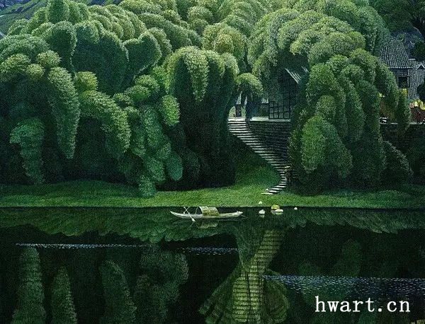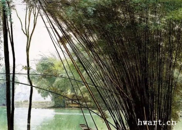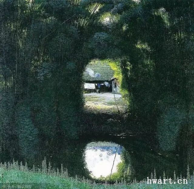 不可否認,簡崇民先生的《川西抒情詩》系列油畫充滿著耐人尋味、百讀不厭、深邃唯美的詩意意境,透過作品,可以讀到畫家靈魂深處的向往:田園、詩意、簡單、純粹。這讓我想起美國歷史學(xué)家亨德里克對十五世紀(jì)畫家安琪里柯繪畫作品的感悟:別人早已忘懷的事情他卻銘刻在心。簡崇民用畫筆畫布與油彩告訴我們,他不是靠著想象在畫畫,他畫的每一處,必定是他身臨其境的地方。他在筆觸的控制、色彩的控制、張力的收放中,釋放出畫家本人靈魂深處的某種情結(jié)或者“情緒”。近距離觀察他的精品油畫《浣花溪》:首先凸顯在眼前的是溪水前那一叢茂密青翠的翠竹林,隱約可見竹林掩映下的一隅傾斜草屋屋頂。天色是川西典型的灰蒙,霧氣重重。近處的溪水清晰地倒映著整個竹林,水面上漂浮著細微的綠色水草,竹林下隱約可見種植的一洼青菜壟。整幅作品,令人靈魂安靜,或許,這樣遠離城市的清澈之地,才是我們所向往的心靈家園。油畫精品《安息地》,是我本人最喜歡的油畫作品之一。畫家用極其細膩凝練的筆觸,描繪出鄉(xiāng)村一望無際的原野。這片莊稼地阡陌交錯,在悠悠清風(fēng)中充滿著極其強烈的生命力。整幅作品,畫家仍維持一貫的層次深淺不一的大片暗綠色、褐色、藍色色調(diào),厚重的褐色與暗綠色交錯,與天空純凈的灰藍色結(jié)合得天衣無縫。在良田縱橫、寂靜無聲平坦無垠的土地上,突兀地高聳出一叢蘑菇云形狀的竹林,天空綻開一片云彩,投射出一縷強烈的白光,撒在田野中央這唯一的竹林上空。畫面在消退了原有強烈的色彩后,顯示出神秘、飽滿、安靜、夢幻而又暗藏著頑強的生命力。畫家或許在用筆觸畫面暗示或者抒發(fā)一種復(fù)雜和純粹的心境。但觀者,比如我,在畫面前,自然可以靜靜領(lǐng)悟到作品所滲透出的是畫家所要傳遞的某些精神訴求。如此安靜廣袤的田園,與竹林里那一抹微弱的燈光,存在與虛無,生命與自然,瞬間與永恒,或許這就是我們靈魂深處最渴求最純粹最簡單的精神安息地。