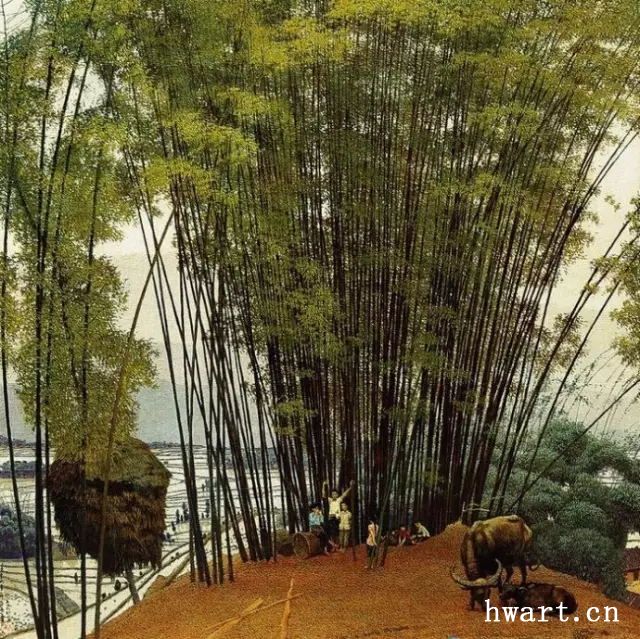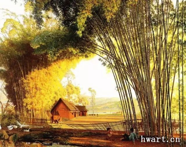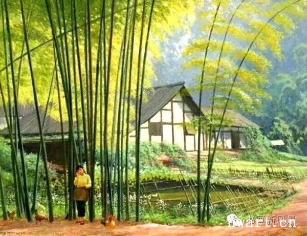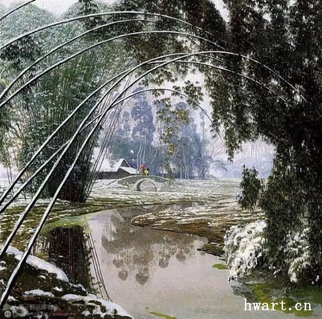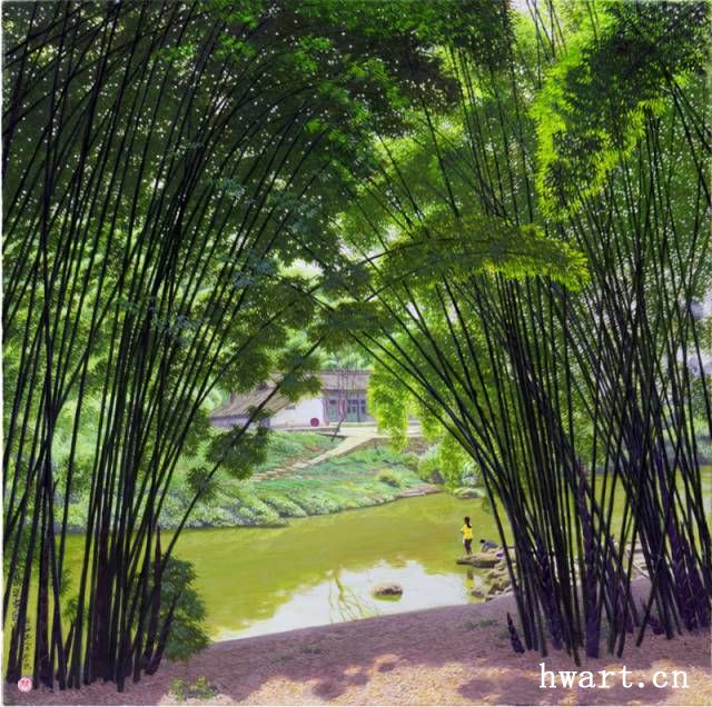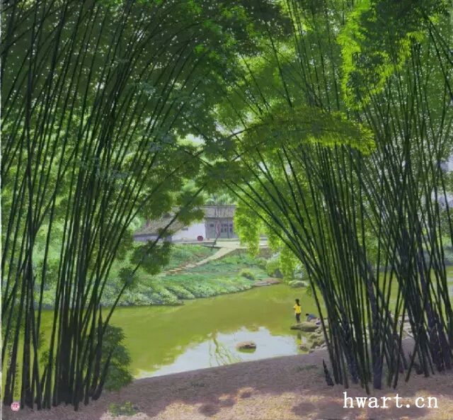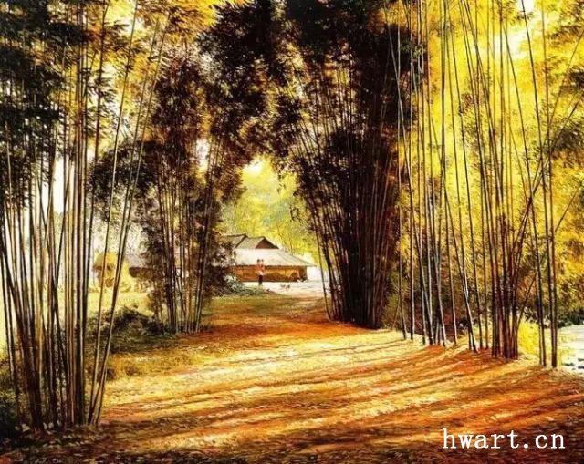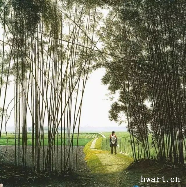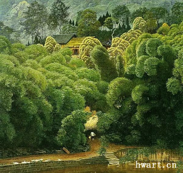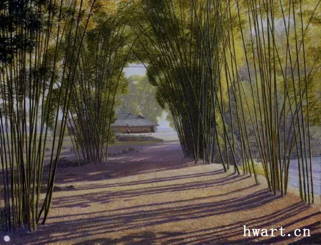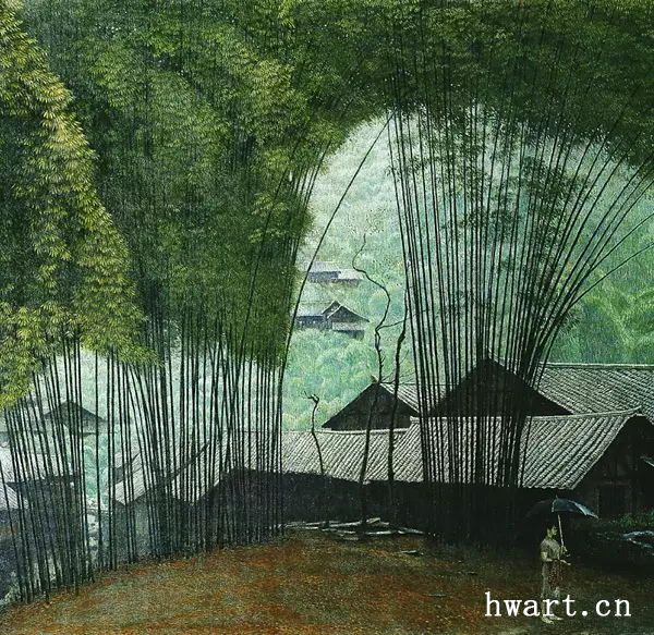 他的寫實油畫,在唯美清澈的視覺效果下,有著川西平原鄉(xiāng)村原野獨有的春意空闊煙橫水漫的純凈氣息。畫面滲透出一縷縷撲面而來的清風(fēng),干凈通透,溫暖淡然。簡崇民先生享譽中外的系列油畫作品《川西抒情詩系列》,洋溢著一個杰出藝術(shù)家嫻熟高超的藝術(shù)理性思維,筆觸、構(gòu)圖、光影與難以用文字描述的微妙氣息,潛伏著畫家個體對自然人文的獨特認知以及對川西壩子的深情眷戀。既有綠樹春絮、樹底人家的隱匿田園,又有落花猶在、綠蔭深駐、霏霏細雨的淡淡鄉(xiāng)情與憂傷。因而,畫面中那些柔韌茂密纖細的翠竹、盤根錯節(jié)的老樹、清澈的溪水、蜿蜒的石徑以及枝丫上密集細碎柔潤的葉片;撐著傘提著竹籃背著娃踩著石板上山的鄉(xiāng)村少婦、竹林中喂雞的鄉(xiāng)村老婦等等,無不在畫家細膩的筆觸、唯美清澈的線條、優(yōu)雅厚重的色彩中,緩緩綻放出川西壩子鄉(xiāng)村的自然之美與人文精神。