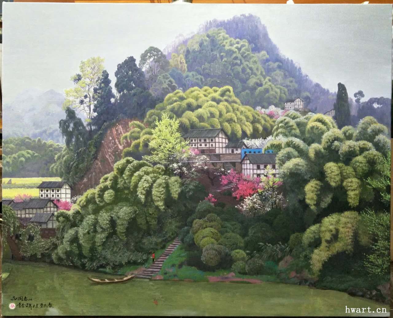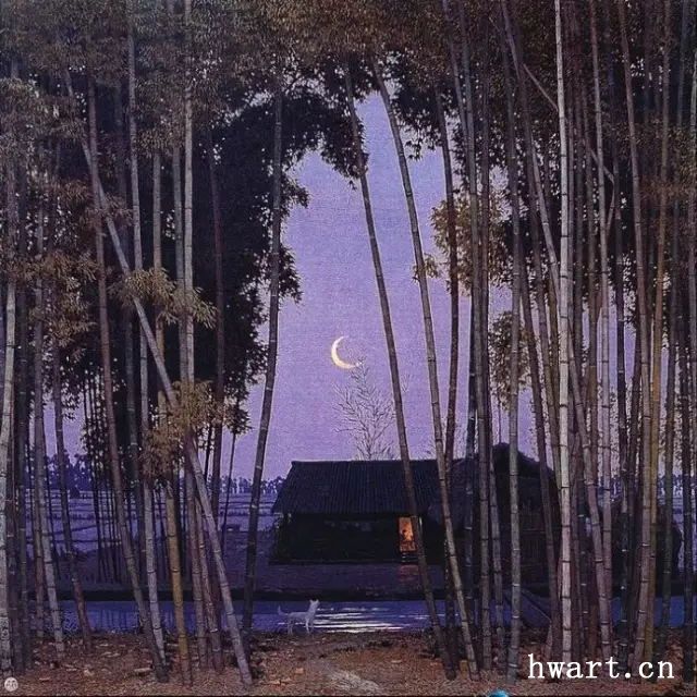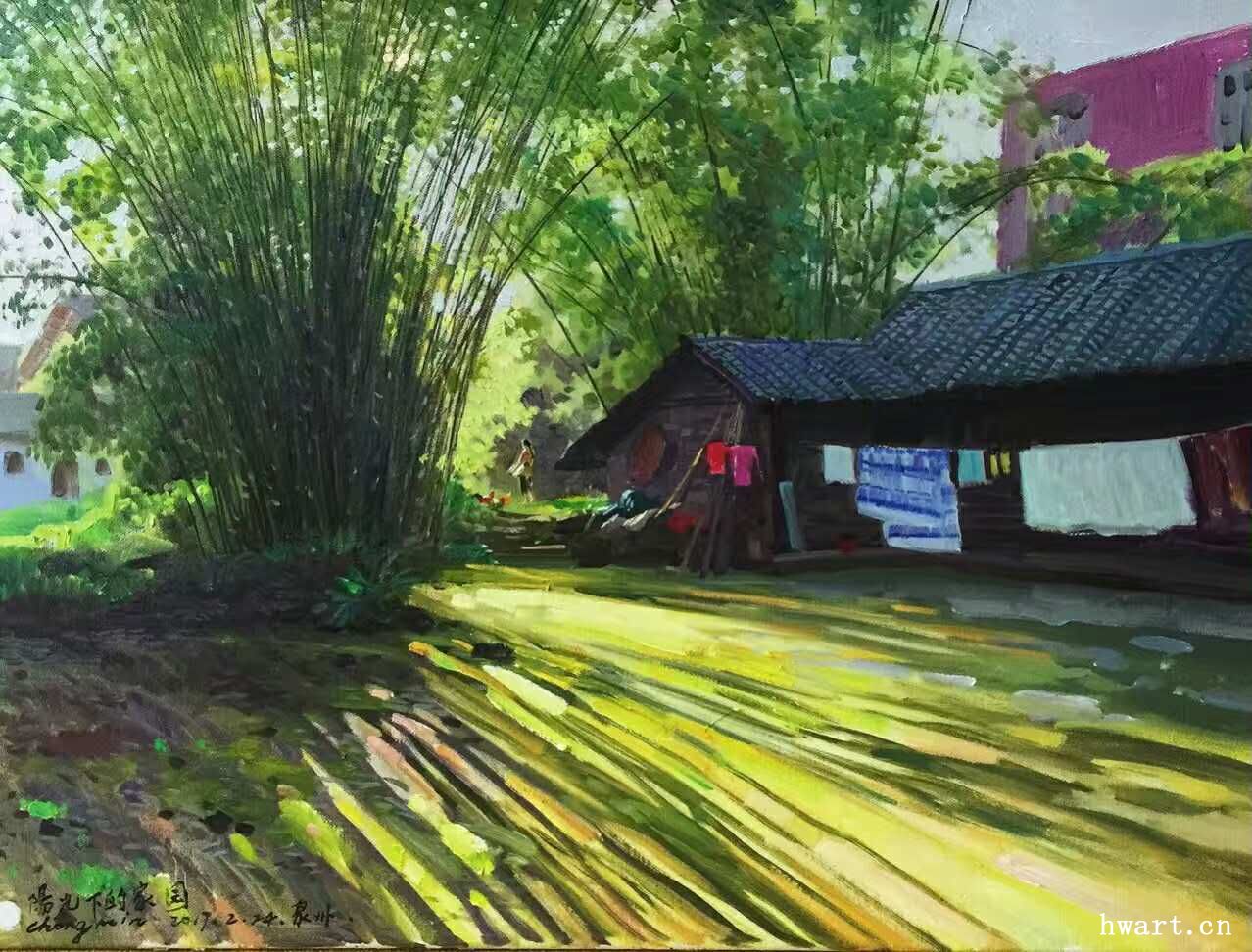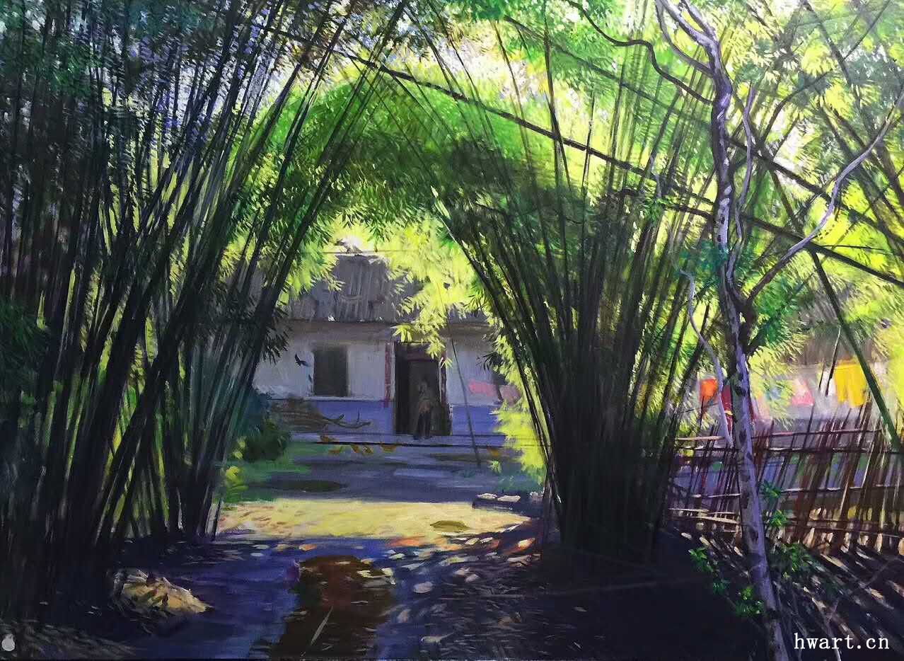 在創(chuàng)作中,藝術(shù)家簡崇民先生的視覺與內(nèi)心是篤定而曠達的。他冷靜的外表下,其實蘊藏著一顆細膩柔軟的藝術(shù)靈魂。他如一位遠遠站在僻靜之處的觀者,冷靜地觀察定格著眼前的一切,天地萬物鄉(xiāng)野村舍,然后再一聲不響地用自己細膩準(zhǔn)確的小紅毛畫筆,細細密密點點滴滴切入肌膚般地描繪出來;有時候,他又以凜冽穩(wěn)健的筆觸、精確高超的寫實手法、清晰入微的線條,于宏觀中切入一個獨特的視角,刻畫出一幅幅川西鄉(xiāng)村最唯美的畫面。油畫精品《夏雨溪山圖》《綠幕》《綠色的情思》《冬天的陽光》《蒼山如海》等等堪稱中國油畫藝術(shù)界杰出的作品并先后被美國、香港藏家收藏。其中,作品《綠幕》給我印象極為深刻:一叢竹,一個洞,一倒影。畫面虛實結(jié)合,竹幕農(nóng)舍、雞鳴犬吠間,折射出畫家所要表現(xiàn)的人類遠古以來的農(nóng)耕文明和母性的溫暖。據(jù)畫家回憶,三十多年前,他獨自離開喧囂熱鬧的四川油畫界,行走在川西的田野小路上,尋找心靈的歸屬?;蛟S,這些尋覓連畫家自己都難以言說動力源自何處。這段時期,曾經(jīng)有十五年的時間,簡崇民先生獨自騎著破舊的自行車、摩托車穿行于四川成都、都江堰、邛崍、眉山、樂山等地。他感覺川西大地猶如一位溫暖的母親,以自己含情脈脈俊逸蜿蜒的身姿,交錯跌宕的阡陌,賦予了自己對生與死、過去與未來、純粹與復(fù)雜的深刻思考。簡崇民在川西大地的暮靄斜陽、竹林農(nóng)舍、清溪頑石以及木樓青瓦中,逐漸找到了自己精神的歸屬。因而,他創(chuàng)作的大量以川西風(fēng)景為主題的精品油畫,震驚中外,名聞遐邇。其作品《曉霧初開》《晚秋圖》《山高水長》《秋天的敘事詩》《明月初上家園》《夢里依稀回故鄉(xiāng)》《夢鄉(xiāng)》等等作品,令美術(shù)界、學(xué)術(shù)界以及中外觀眾無不驚嘆其獨特視覺、細膩筆觸、肌理韻味以及極致高超的繪畫水平和充滿著東方意蘊的特質(zhì)。