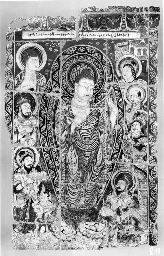 此畫(huà)描繪的是釋迦牟尼佛有一世做大商人時(shí),為了表示對(duì)六世佛的崇拜,他用大象、馬匹、黃金、女人、寶石和珍珠,建造了一座精美的園林,供奉給了六世佛。畫(huà)面中主佛下左右兩供養(yǎng)人被日本人所竊,此圖右下畫(huà)胡帽長(zhǎng)髯二跪姿男供養(yǎng)者,各托盤(pán),以盤(pán)中的七個(gè)袋狀物供奉佛陀。左下部一長(zhǎng)髯者雙膝跪地,后隨一駝一馬,銘文中曰長(zhǎng)者,而壁畫(huà)中表現(xiàn)的卻是佩劍武士。圖版上部及左下略殘。