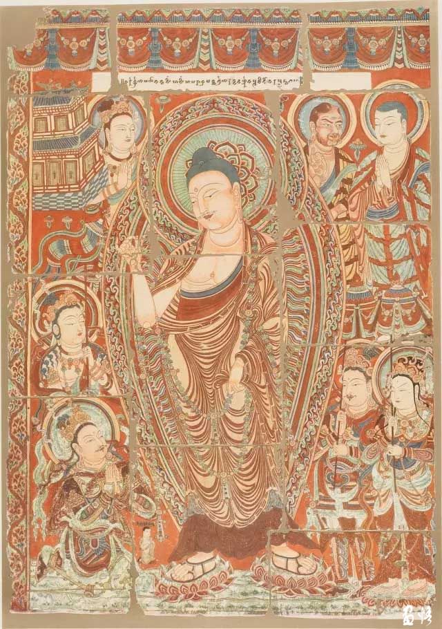 誓愿圖主要是指柏孜柯里克石窟第32窟、第23等窟釋迦牟尼佛于前生供養(yǎng)諸佛的佛立像圖,有人稱(chēng)之為《說(shuō)法圖》,也有學(xué)者稱(chēng)之為《供養(yǎng)畫(huà)》。誓愿圖是由來(lái)自東、西方和敘利亞的畫(huà)家在十至十一世紀(jì)期間創(chuàng)作了這組佛教壁畫(huà)。壁畫(huà)是在日曬磚墻上涂上摻有植物纖維的石灰土,用青金石、氧化銅、朱砂、金箔等作為顏料繪制而成的。圖像大都袒右肩立佛,通身背光,有頭光,旁有弟子、菩薩、天王及供養(yǎng)人圍繞。有的還畫(huà)有駱駝、驢、馬及房舍、園林。整個(gè)畫(huà)面大都呈紅色基調(diào),繪制細(xì)密。人物造形及服飾帶有明顯的地方特色。