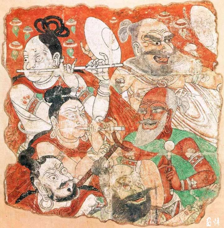 這幅畫(huà)原位于第33窟主室東壁,現(xiàn)藏日本東京國(guó)立博物館。表現(xiàn)的是婆羅門(mén)外道聞佛涅槃后,歡心鼓舞,奏樂(lè)慶祝的畫(huà)面。這些婆羅門(mén)身材各異,造型生動(dòng),神態(tài)逼真。畫(huà)中出現(xiàn)的樂(lè)器有琵琶,篳篥,橫笛,鐃,鼓等。