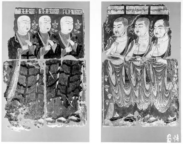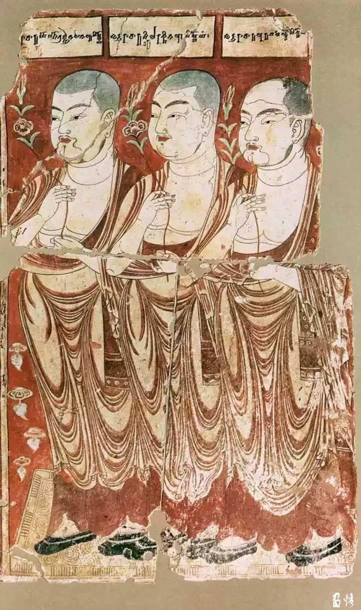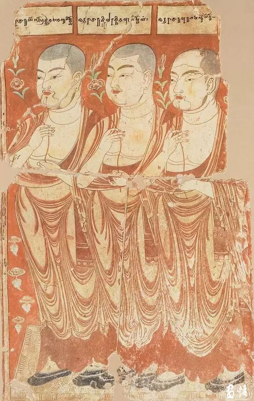 這三位僧人位于右甬道內(nèi)壁。三位僧人身穿袒右袈裟,與上圖的都統(tǒng)像不同。畫(huà)面上方的榜題不是漢文與回鶻文,而是梵文,加上他們的長(zhǎng)相也具有異域特點(diǎn),說(shuō)明這三位僧人可能是印度僧人。這些僧人應(yīng)該都是回鶻王家寺院的高僧。