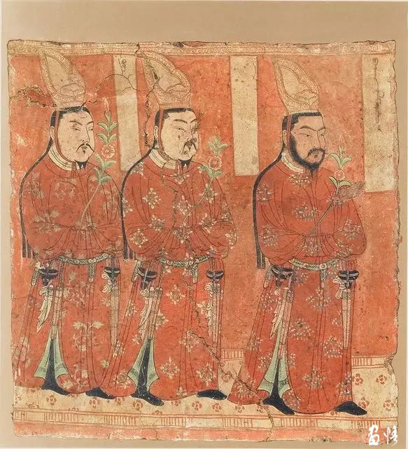 供養(yǎng)人面部方圓,頭頂束冠,腦后垂發(fā),一臉絡(luò)腮胡,樣貌穩(wěn)重而堅(jiān)毅。一手持花供養(yǎng),周?chē)€有紅色的樓閣和簾幕作為背景。