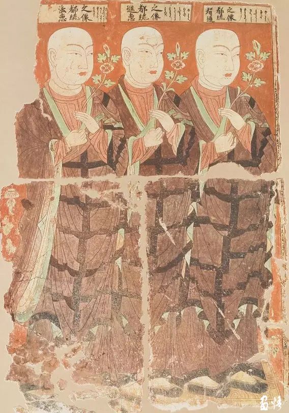 這幅畫(huà)位于20窟左甬道內(nèi)壁。上方有漢文和回鶻文榜提“智通,進(jìn)慧,法慧三都統(tǒng)供養(yǎng)像”,表明這三位僧人均是管理僧眾事物的僧官。畫(huà)面中的三位僧人穿交領(lǐng)廣袖的中原式袈裟,雙手持花供養(yǎng)。人物面目具有中原人特征。