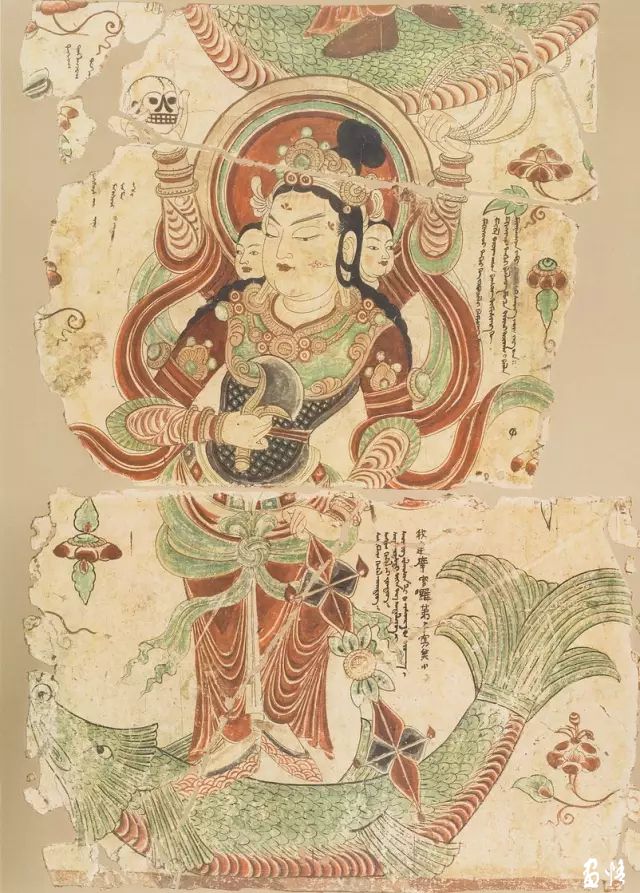 這身明王像三首四臂。手中分別持斧,索,骷髏和金剛杵,站立在一條綠色大魚(yú)的身上。周?chē)谢佞X文和漢文榜題。明王眼神低垂,左腳抬起,右胯部微向外扭,神性氣質(zhì)濃厚。